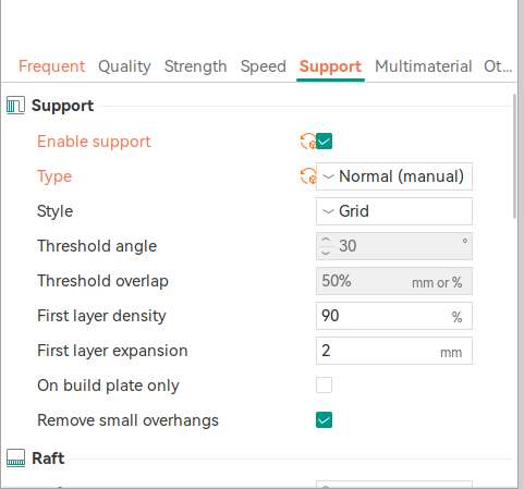 Then, in the Support settings, I enabled supports and selected the type as Normal (Manual).