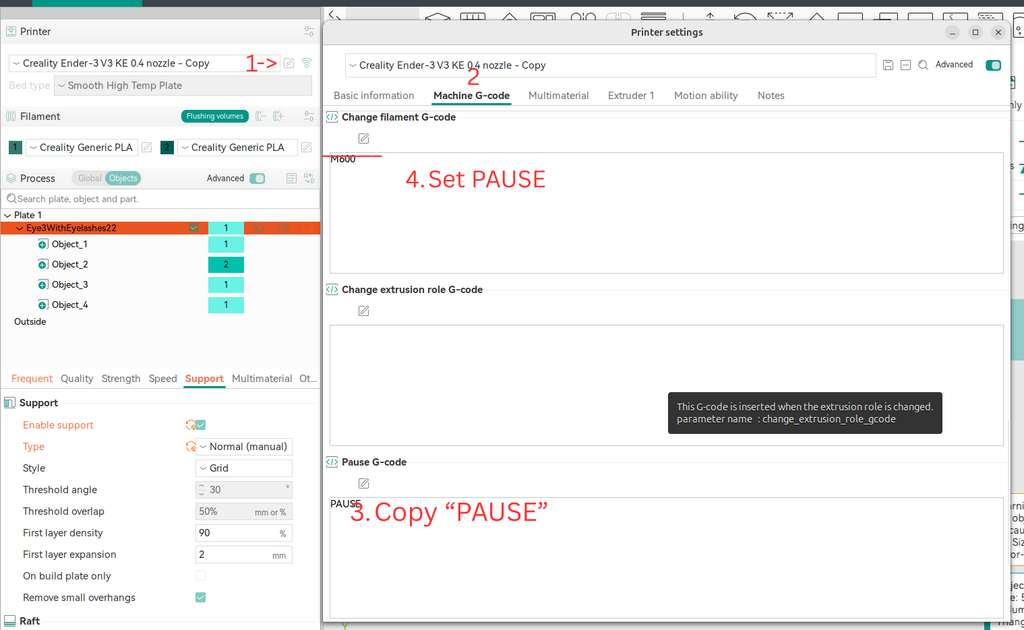 Next, I added a new filament color, assigned it to the required part of the model, and used it to set a pause for filament change during the print.