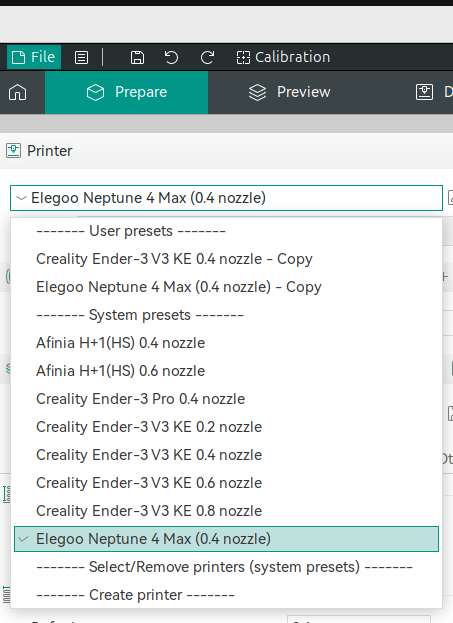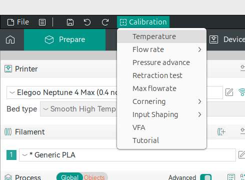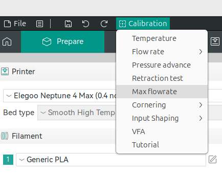 By repeating the previously described steps — selecting the correct filament profile, choosing the appropriate printer profile, and connecting to the network using the correct IP address — I then navigated to the Calibration section and selected Max Flowrate. After the test model appeared on the build plate, it was ready for printing.