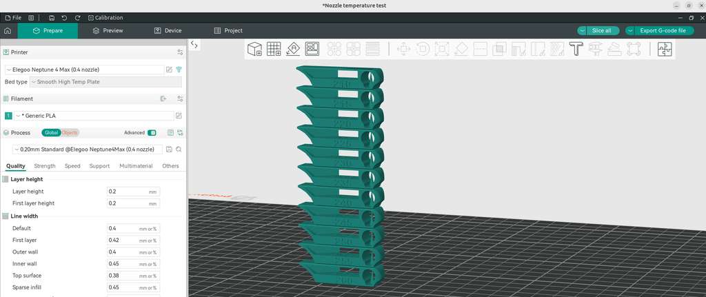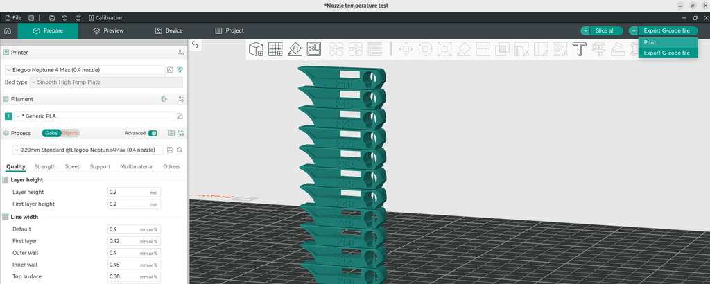 Next, we performed filament tests for both PLA and PETG materials using three different printers in order to print our scanned models with maximum accuracy. After dividing the work, I conducted the tests using the Elegoo Neptune 4 Max (0.4 mm nozzle).