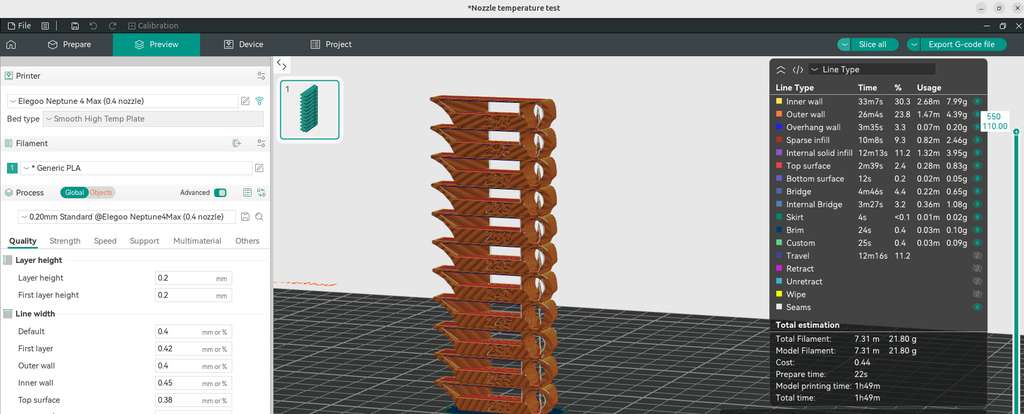 After placing the test model on the build plate, I clicked Slice. The slicer then switched to the Preview tab, showing a layer-by-layer visualization, estimated print time, as well as material usage and cost estimation.
