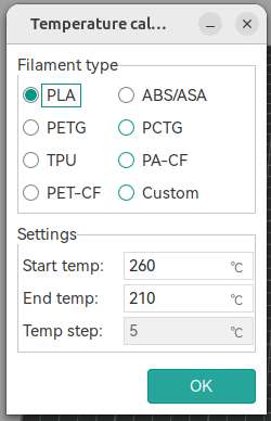 Then, I navigated to Calibration → Temperature and set the temperature range for the test print.