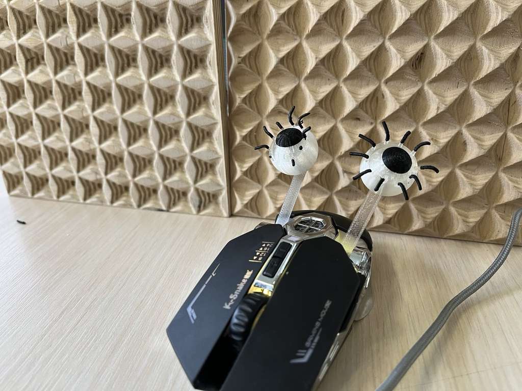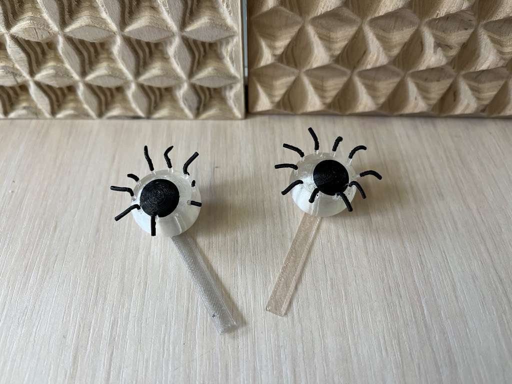 The 3D printed eyes contain curved surfaces and undercuts that would be difficult to reach using subtractive manufacturing tools such as CNC milling. Since CNC tools remove material from the outside, they cannot easily create internal shapes or recessed features. Additive manufacturing allows the object to be built layer by layer, making these geometries possible.