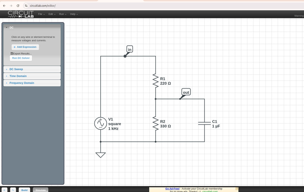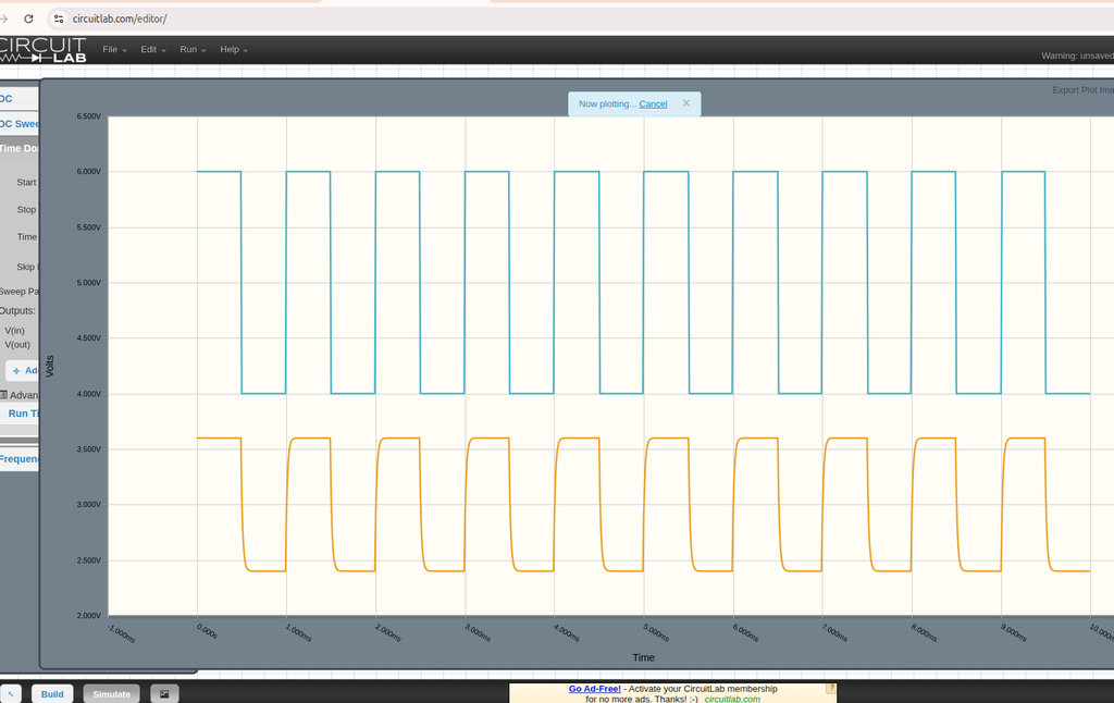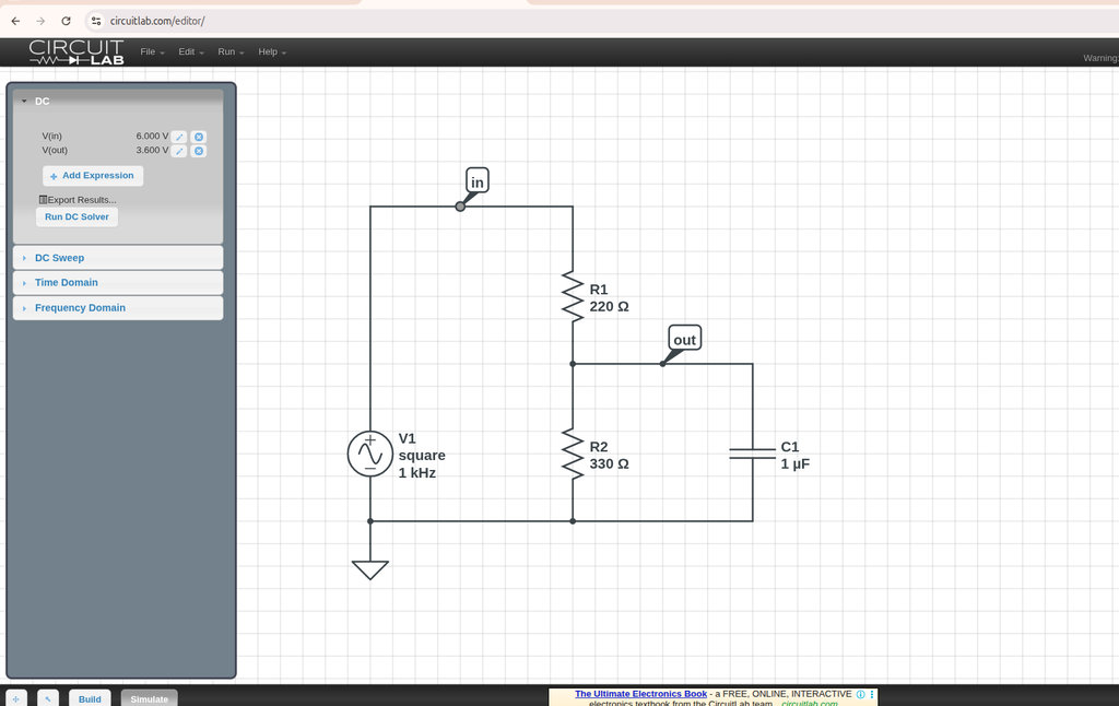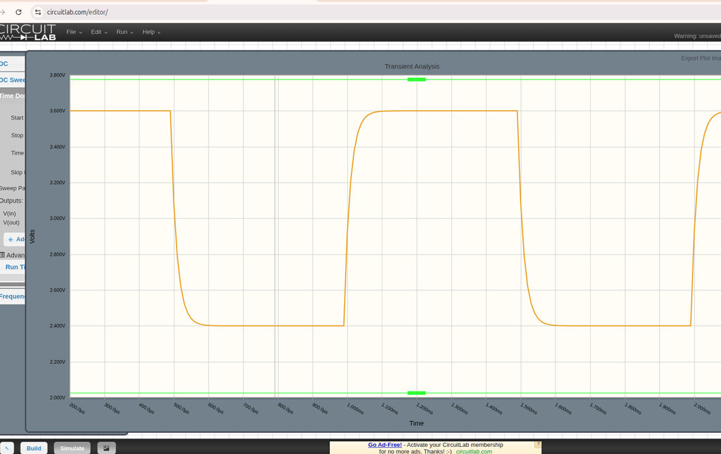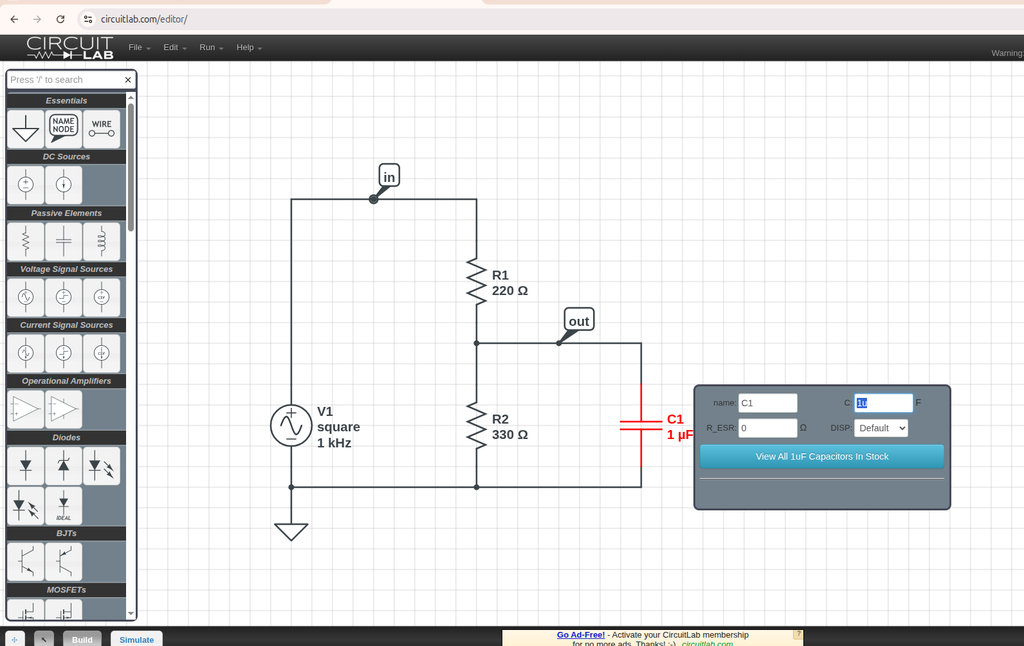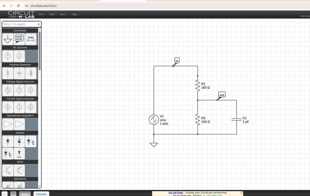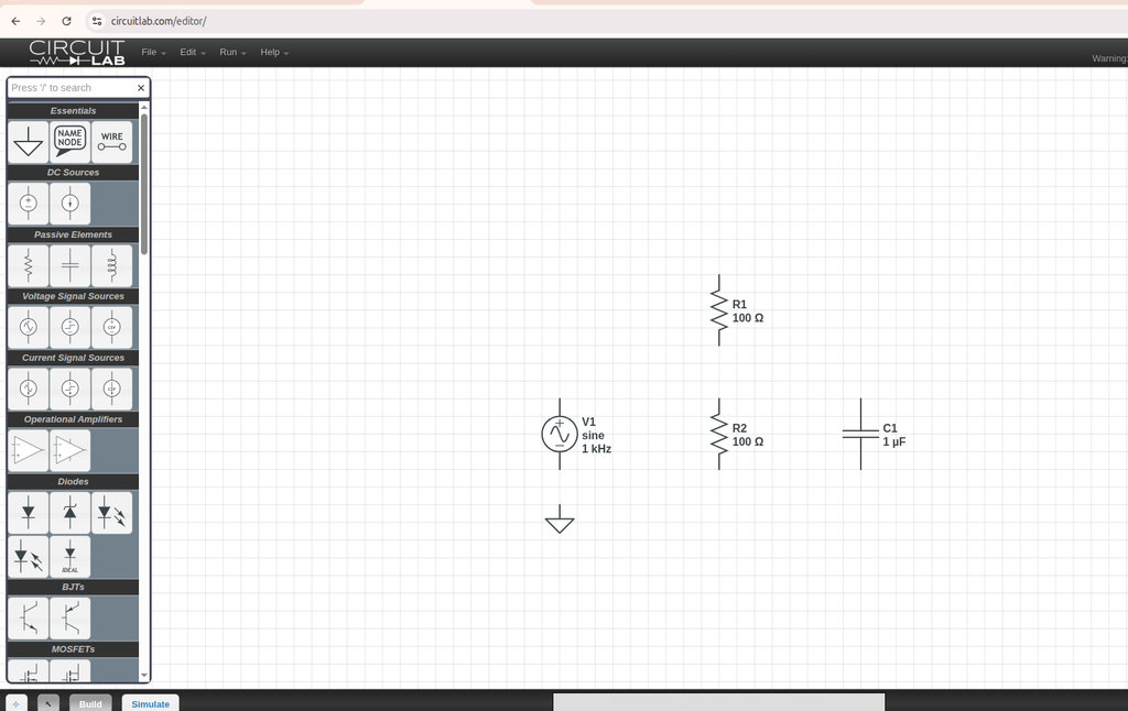 Since my operating system is Ubuntu, I encountered some difficulties downloading and running LTspice. Because of that, I decided to use the CircuitLab online simulator, which allows building and testing electronic circuits directly in the browser without installing local software.