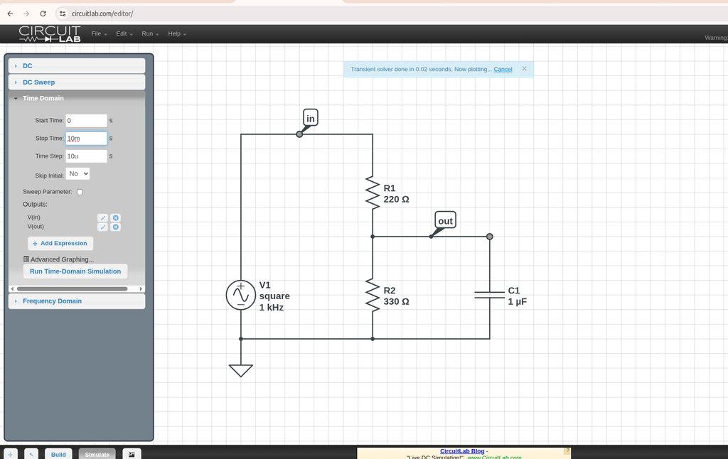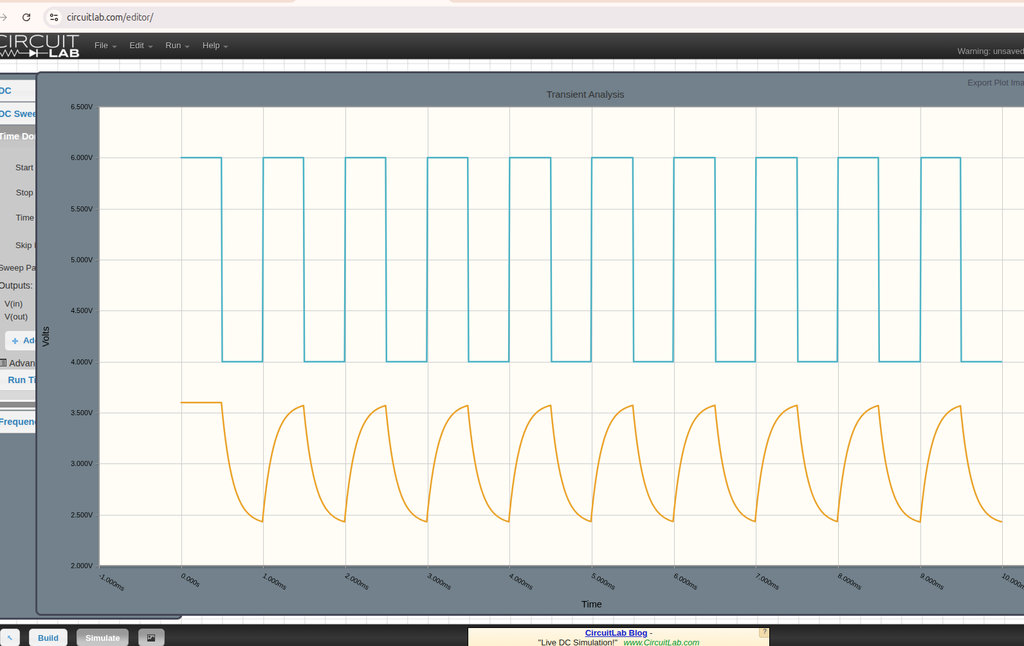 Now, we get a lot of the exponential RC behavior here, so let's try changing the capacitor size to see what happens. We click "Build", then double click the capacitor, and change it to ".1u". Back to simulate, then "Run time-domain simulation", and now we see a lot more square-looking output signal.