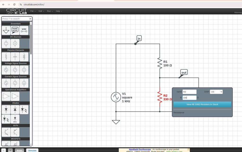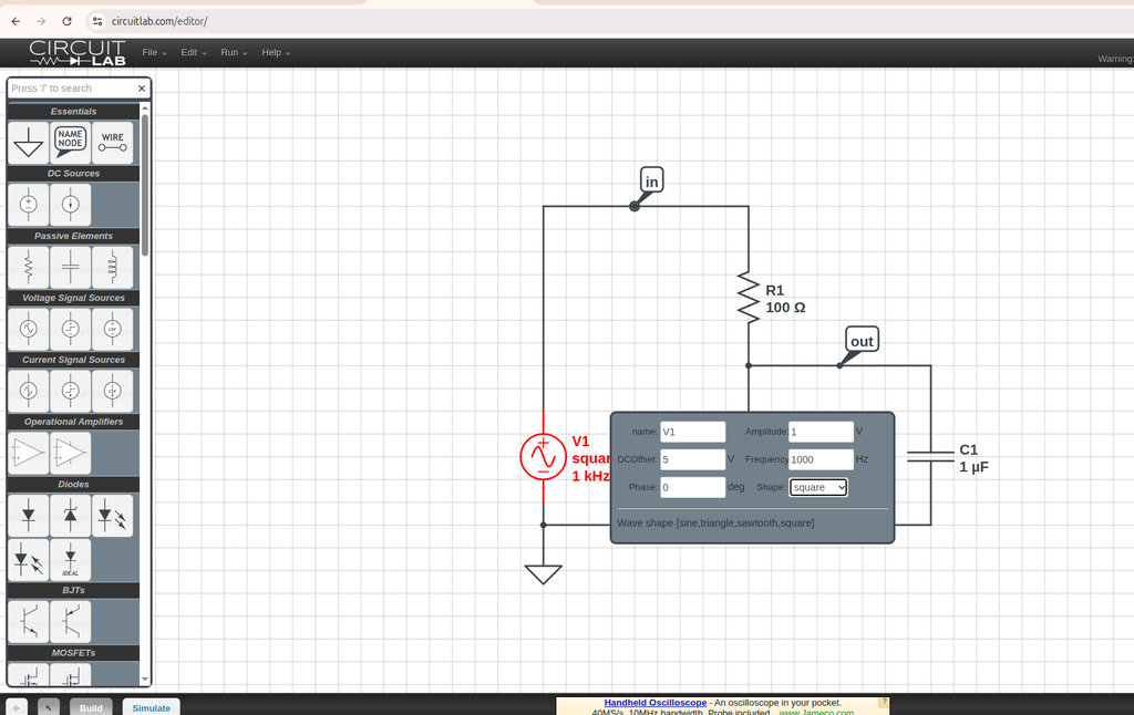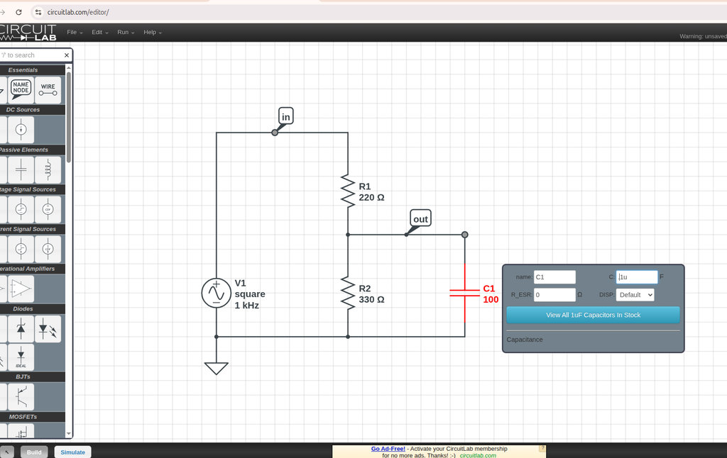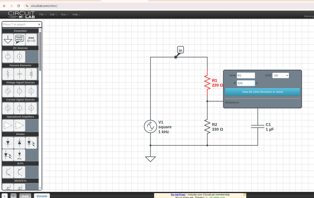 For the simulation assignment, I will build an example of a square wave circuit. This example allows demonstration of both time-domain analysis and frequency-domain analysis, which are fundamental concepts in electronics.