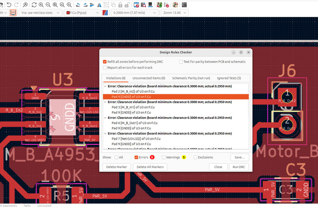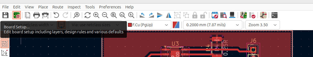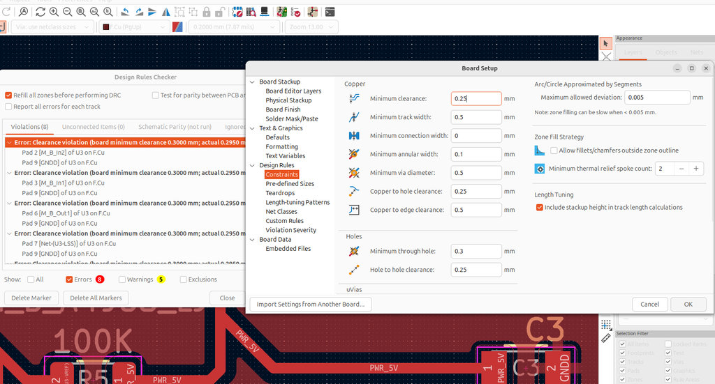 Next, when I saw the "Clearance Violation" message, I opened the Board Setup window again. In the Constraints section, I set: