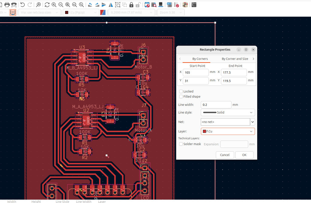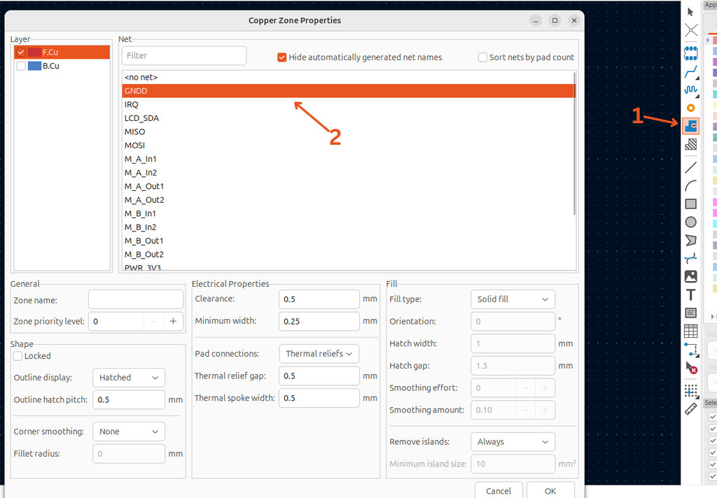 Next, using the Draw Filled Zones tool, I need to make the entire PCB area connected to GND. By selecting the net that should be GND, the PCB looks like this.