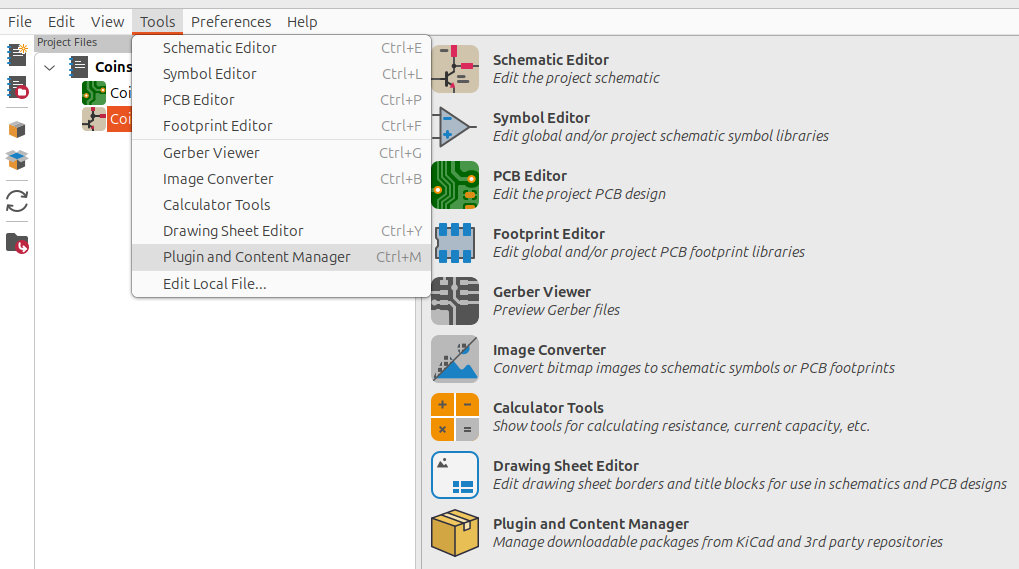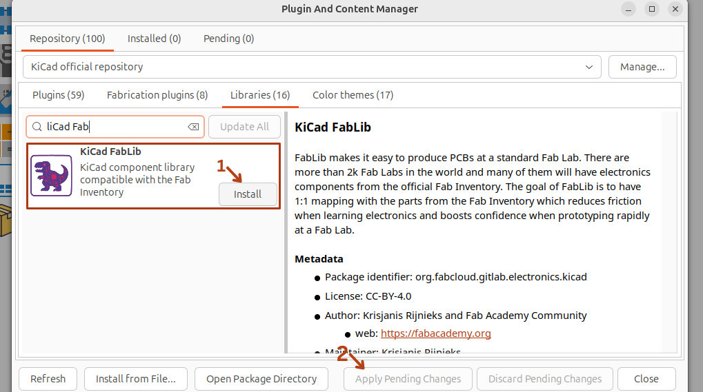 We open Tools > Plugin and Content Manager, select the Libraries tab, search for "KiCad FabLib", click Install, and then Apply Pending Changes.