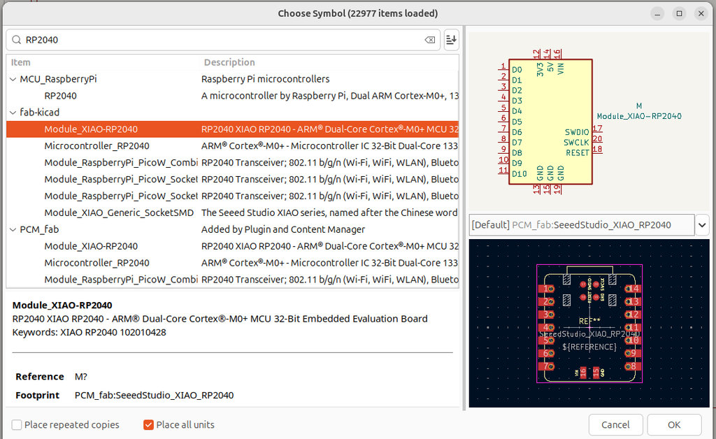 First, from Place, we select Place Symbols, and in the opened window we search for RP2040 and from the fab-kicad subsection select it.