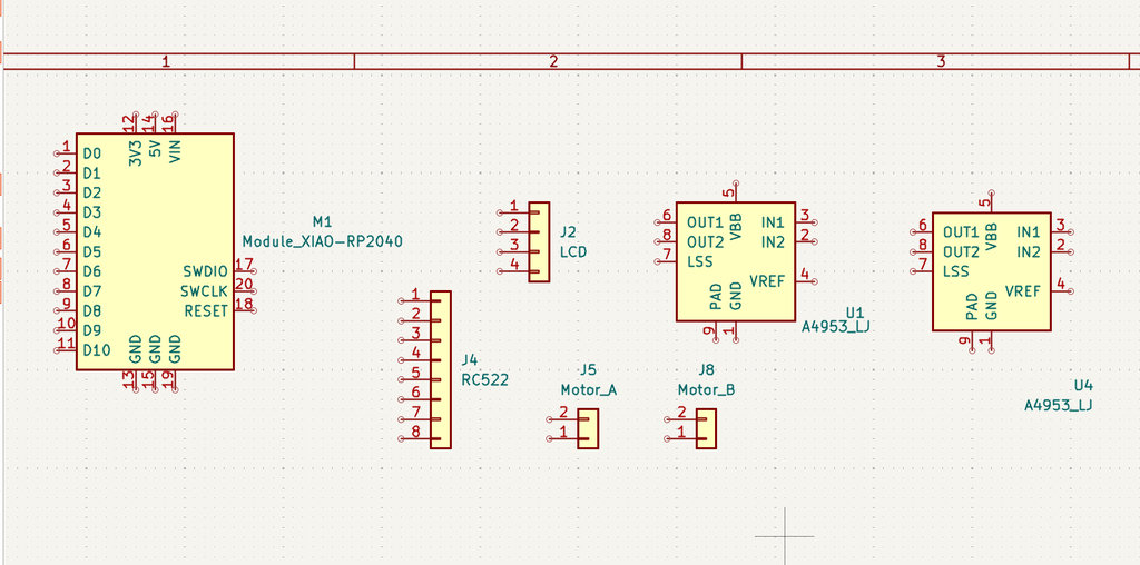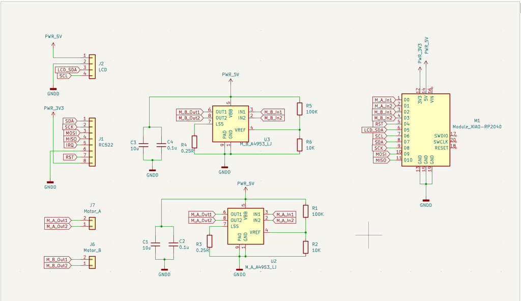 “Now need to generate another image when se started week 6 - Electronics Design. She Design PCB with this components: microcontroller Module XIAO-RP2040 A4953_LJ, NFC capable of reading NFC tags RC522, LCD(I2C), 2x Motor Driver A4953_LJ , Motor_A Motor_B pinout connect dogether to PCB Design.And also need to create case for this PCB. I want to pcb CASE AND CAR chassis.She designed it with KiCAD. And into the LCD needs to print the count of collected coins(NFC tags)”