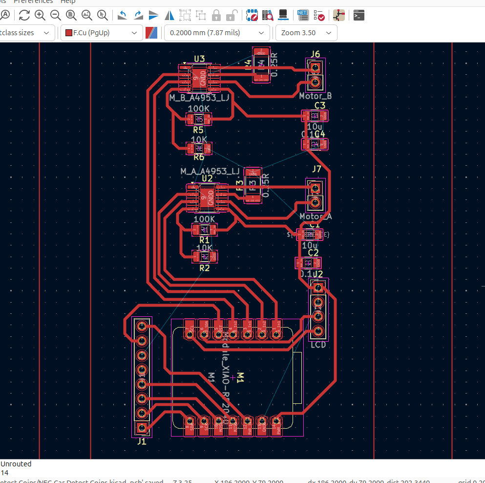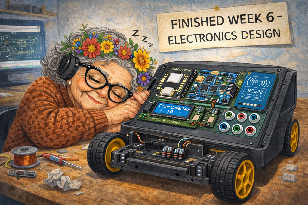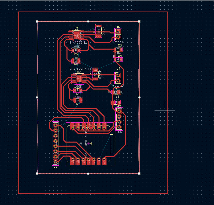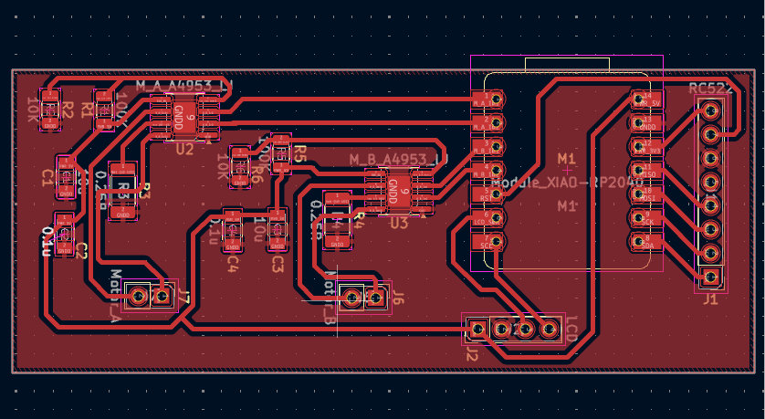 This week I designed the electronics and PCB for my final project. I defined the system architecture for the car-robot coin collection system and selected components such as the RP2040, NFC reader, motor drivers, and I2C LCD. After studying the datasheets, I created the schematic in KiCad and then routed the PCB in the PCB Editor with a GND filled zone. I enjoyed working with KiCad and seeing the hardware system come together. The most challenging part was carefully reading datasheets and ensuring correct connections and power design. This week I learned how to move from schematic design to a real PCB layout.