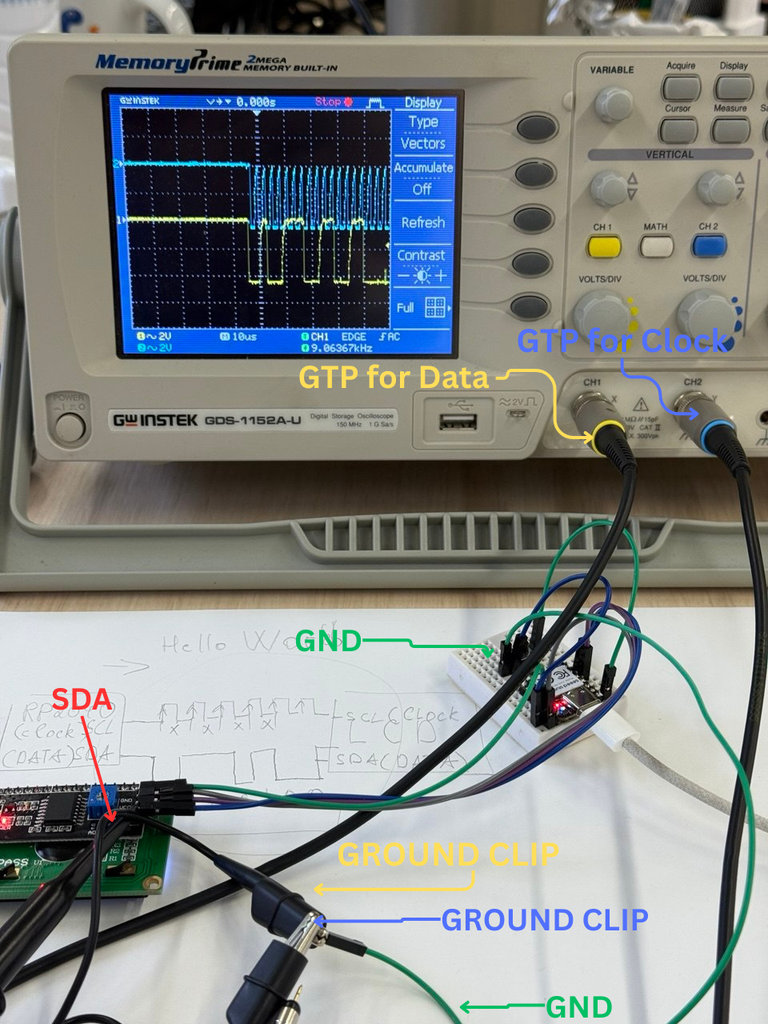 First, we wrote a simple program that generates a counter signal. After uploading the code, we connected the RP2040 to the oscilloscope: the GND pin was connected to the probe’s Ground Connector, and the signal pin (SDA) was connected to the probe’s Grabber. This allowed us to observe the signal behavior and measure the timing directly on the oscilloscope.