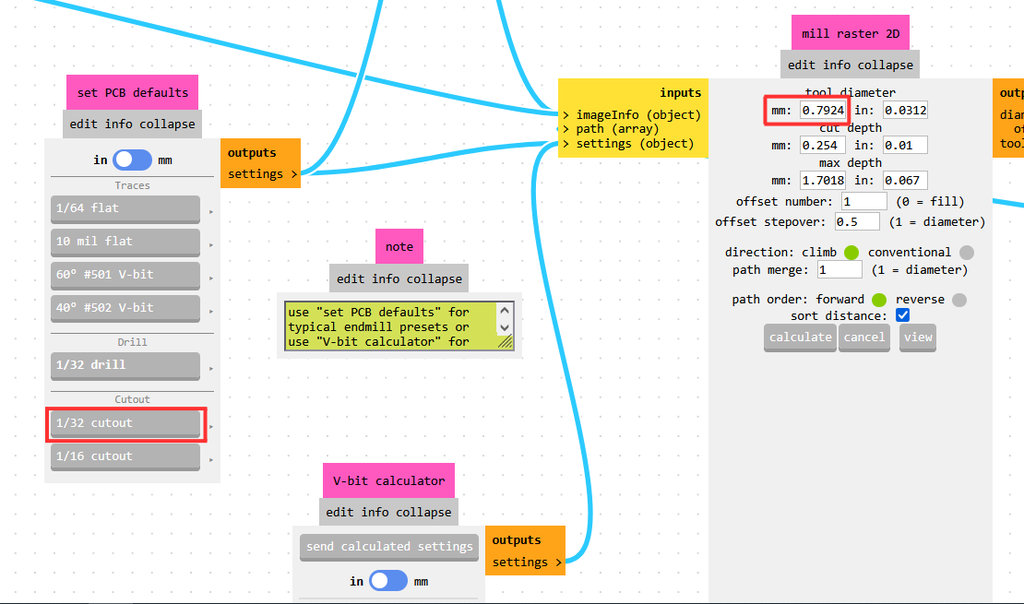 For the cutting operation, I selected a 1/32 inch milling bit, which is approximately 0.8 mm.