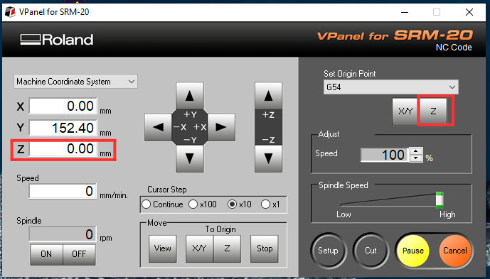 After changing the milling bit, I needed to set the zero position again, but this time only for the Z axis. I found the correct Z position and reset it by pressing Zero Z.