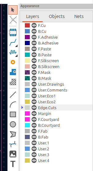 Edge.Cuts function, so the CNC machine would cut out the PCB shape instead of engraving it. In the Appearance panel, I selected the Edge.Cuts tool and marked the rectangular area that needs to be cut out. I also added circular holes on the edges using the same Edge.Cuts tool so that later I can mount the PCB.
