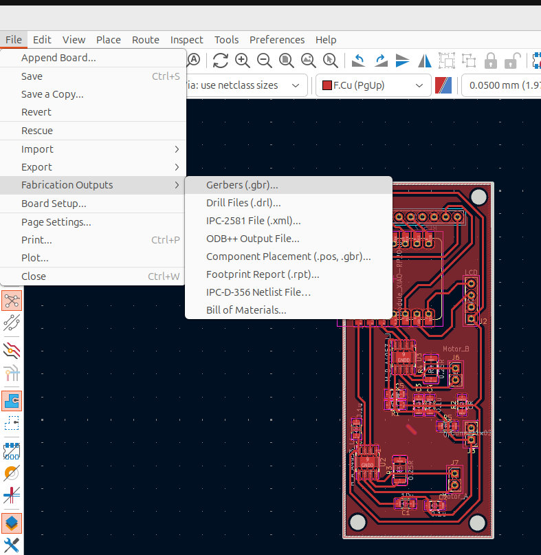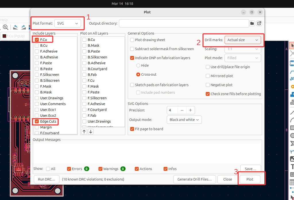 After that, the file was ready to be exported. I selected File → Fabrication Outputs → Gerbers (.gbr). In the opened window, I changed the plot format from Gerber to SVG. I also set Drill Marks to Actual Size. I checked that in Include Layers only F.Cu and Edge.Cuts were selected, since these layers are needed for engraving and cutting. Then I pressed Plot.