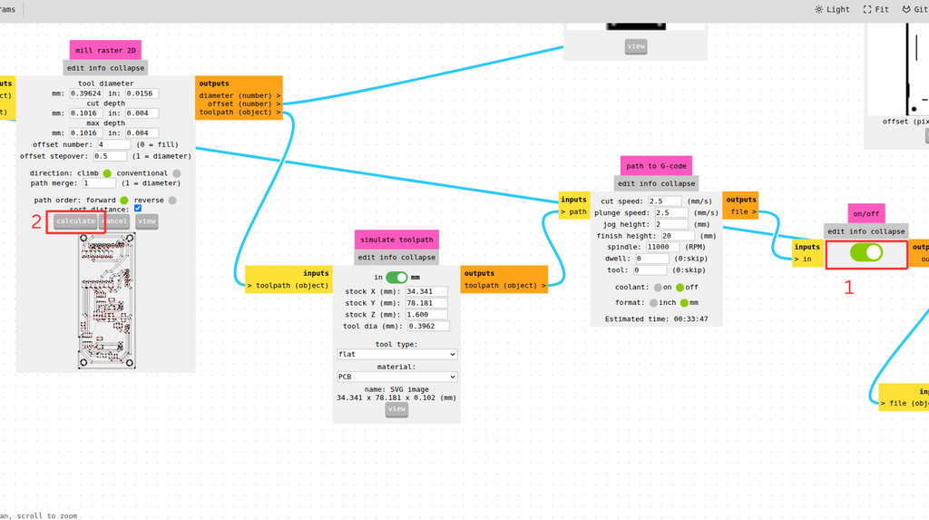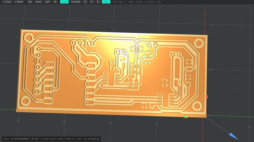 In the Set PCB Default section, I selected 1/64 flat when using inch units, or 0.4 mm flat when using millimeters. In the Mill Raster 2D section, the parameters automatically updated based on the default settings, although they can also be adjusted manually. After that, I pressed Calculate, which immediately generated a 3D preview of the PCB design, where possible errors can be detected.