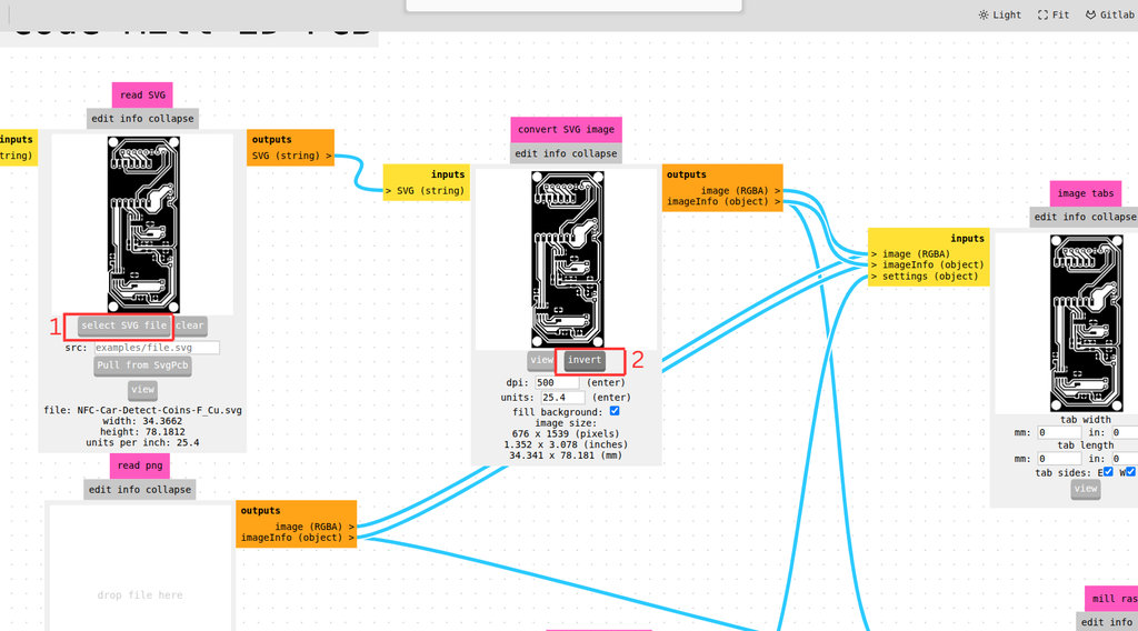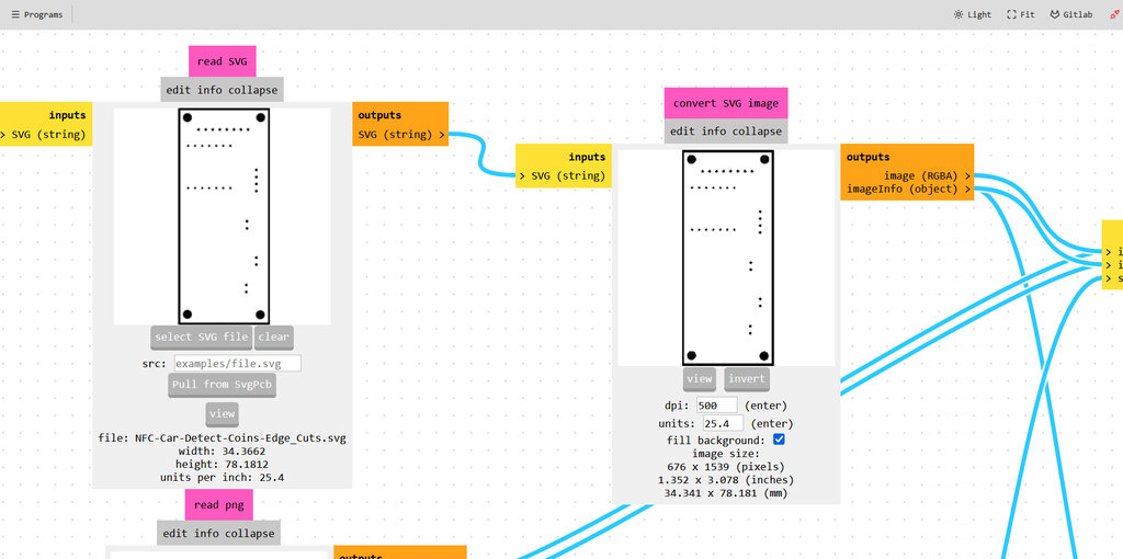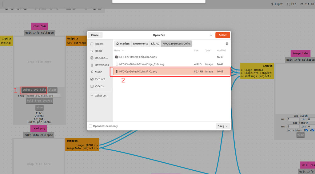 Next, I went again to modsproject.org. This time I selected Select SVG file and loaded the file corresponding to Edge.Cuts, which contains the outline of my PCB, including the edge holes and the holes for the pin headers.