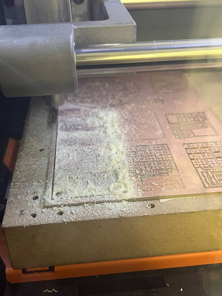 After the engraving finished, I carefully cleaned the dust using a vacuum cleaner without removing the PCB Bed, since I needed to change the milling bit to cut the edges.