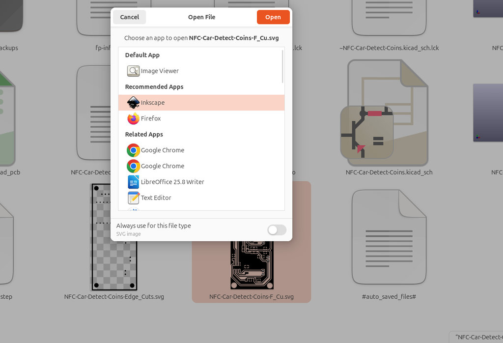 Next, I opened the SVG file in Inkscape to verify that the PCB dimensions had not changed.