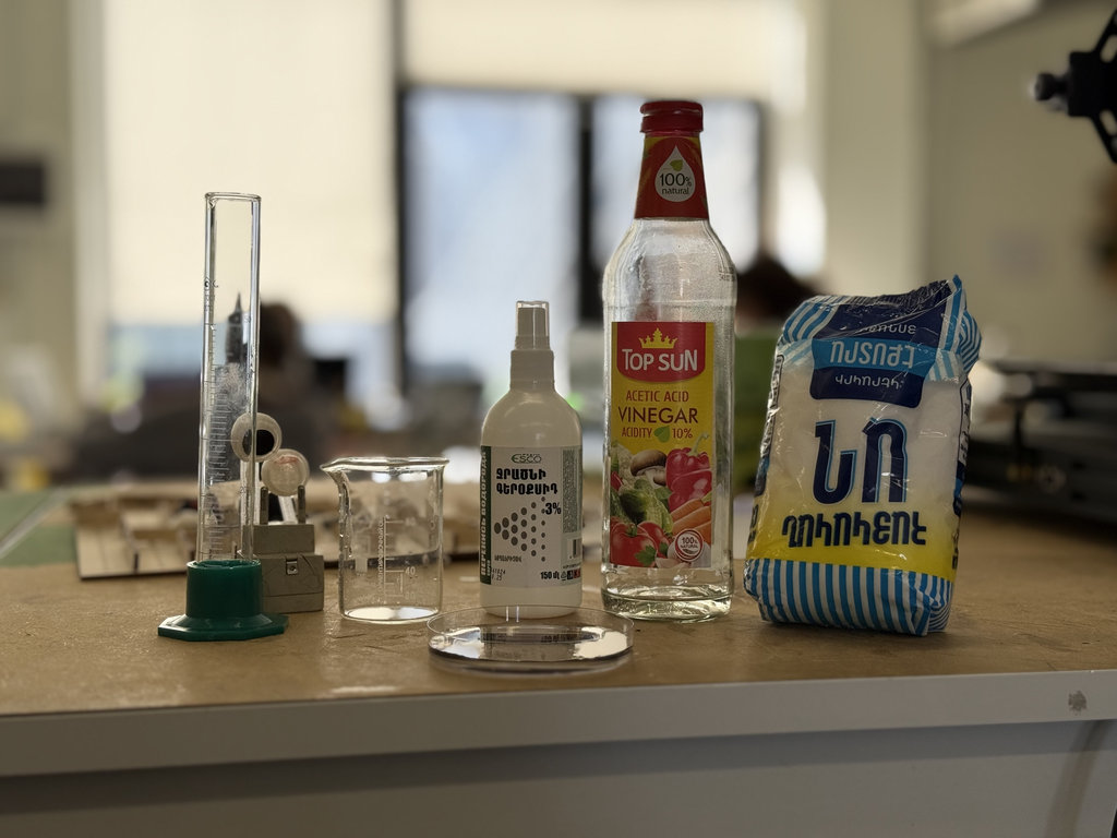 We used 3 parts white vinegar, 2 parts hydrogen peroxide, and a small amount of salt.