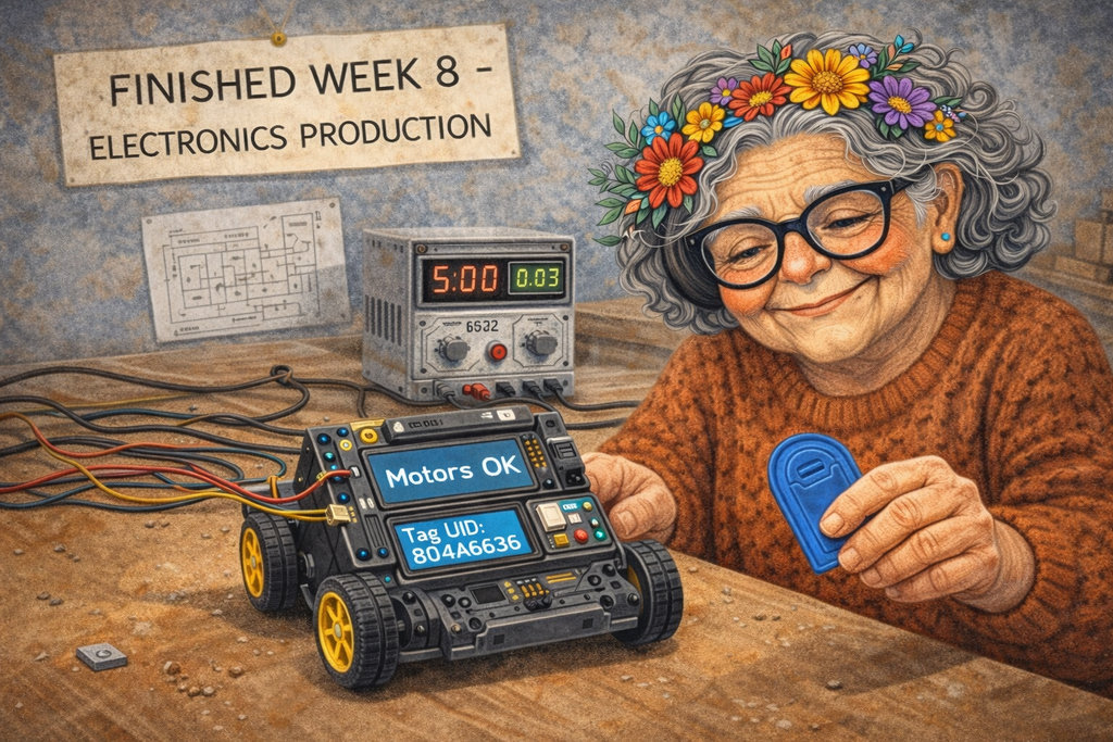 “Can you generate an image about my week 8(Electronics Production)? When this grandmother started cutting her PCB design with the Roland CNC machine, and also tested this PCB and connected to Power supplay and Drive 2 DC Motors, and Also connected NFC Rc522 and want to programm to se tag fine result, and print into I2c LCD Tag id”