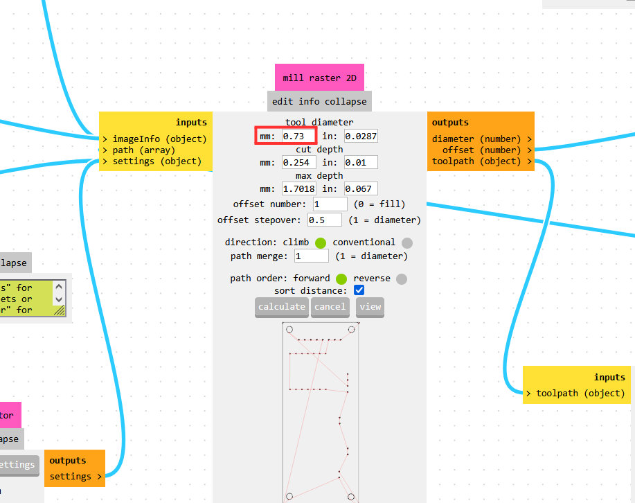 To solve this, I slightly adjusted the parameters by manually setting the tool diameter to 0.73 mm in the Mill Raster 2D section. This allowed the toolpath to generate correctly, since the program assumed the bit could fit into the holes. This workaround worked successfully.