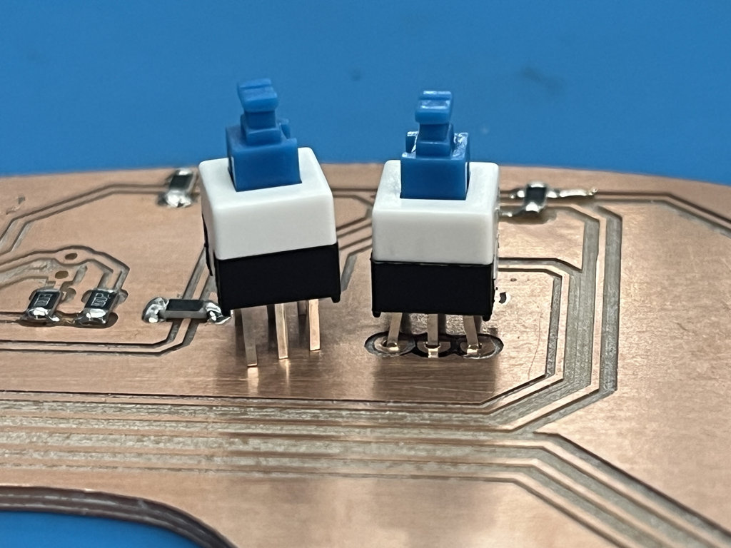 While installing the switch button footprint, I realized that I had downloaded the wrong footprint size, so I had to slightly bend and adjust the pins to fit them properly.