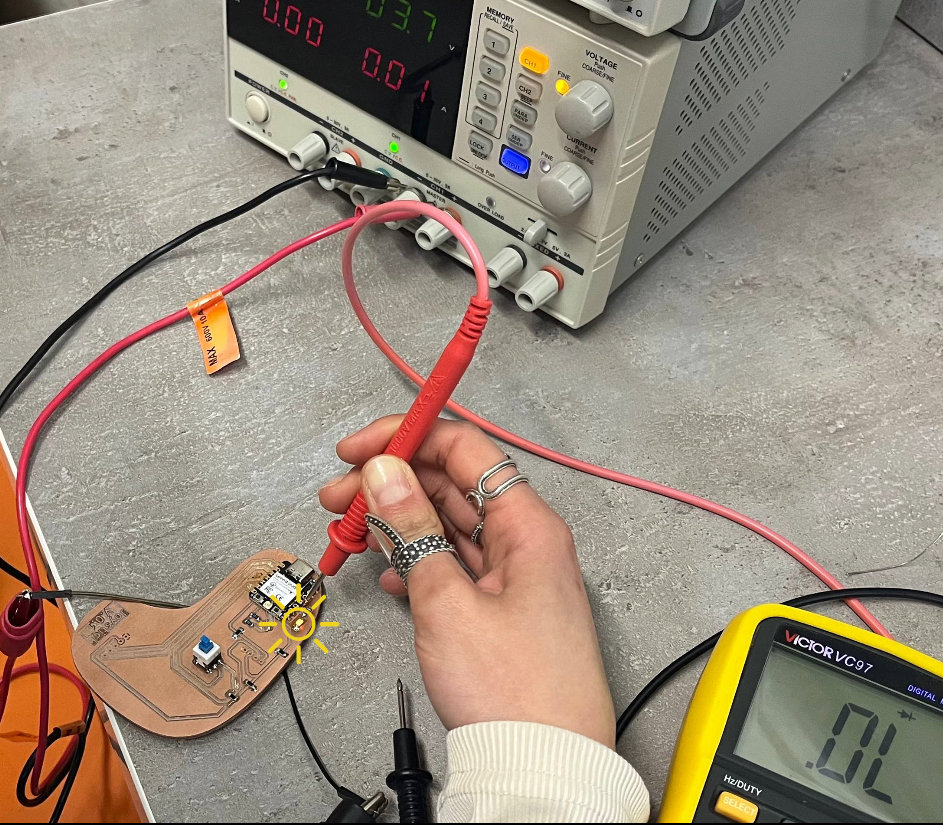 To verify that the MCU was soldered correctly, I wrote a simple code to turn on an LED. This helped me confirm that BAT+ and BAT− connections were correct. However, instead of connecting the battery directly, I used a Power Supply to provide 3.7V to the battery pads using two wires.