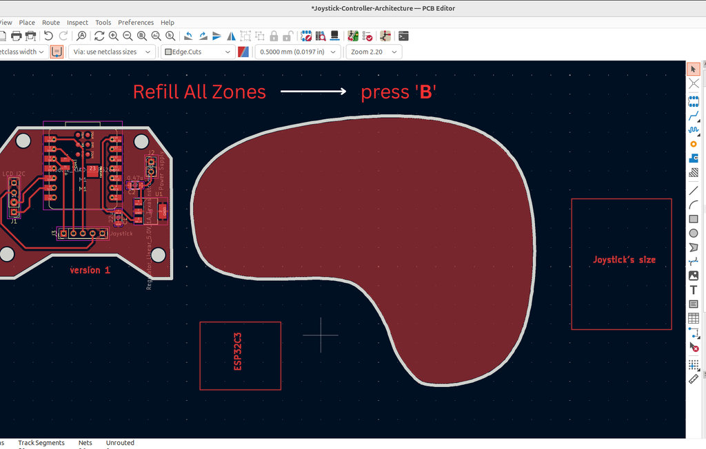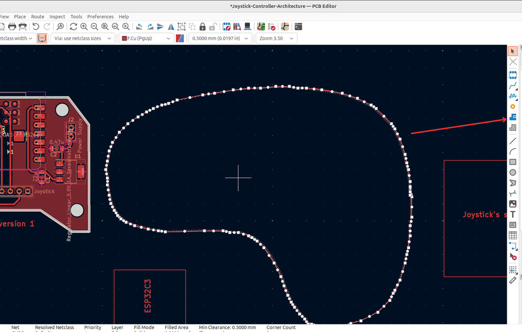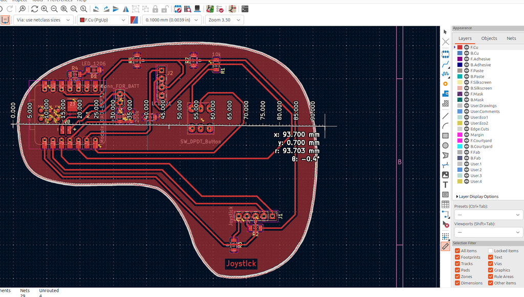 By defining the Edge.Cuts, I started the long and detailed process of assigning the entire area as GND, which was challenging due to the complex curves in my design.