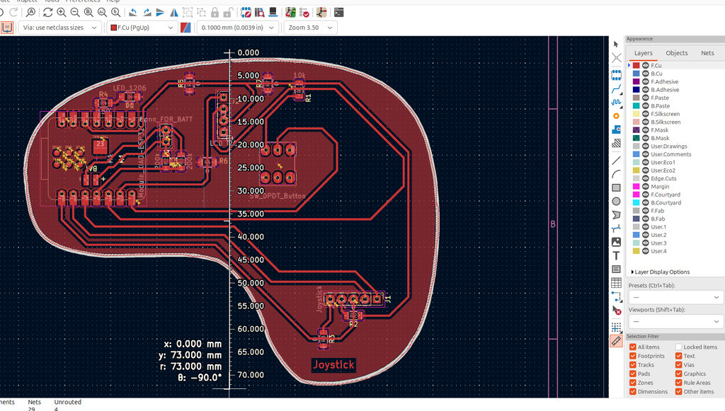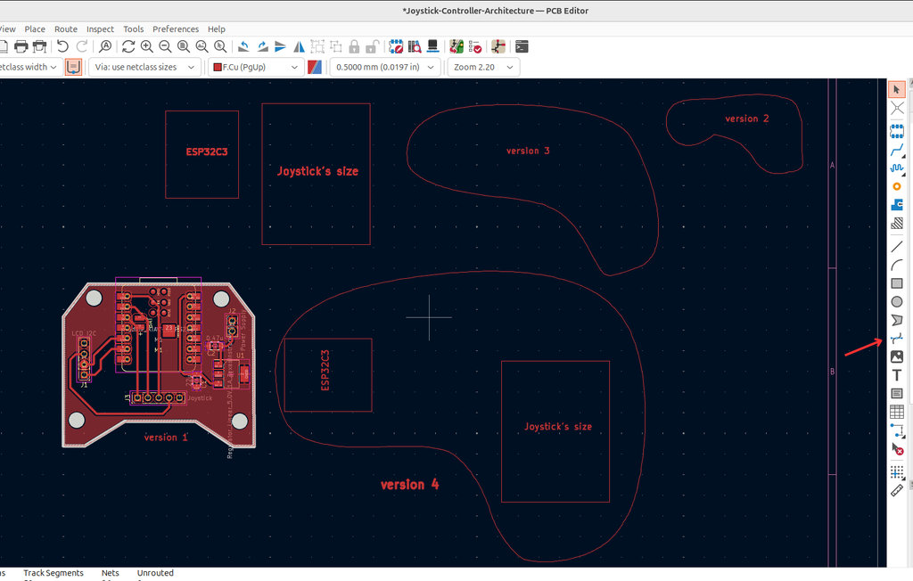 Then, moving on to the PCB design, I initially started with a classic joystick layout, but I decided to add my own style. After a few experiments, I realized that it would be better to use the real dimensions of the components before continuing.