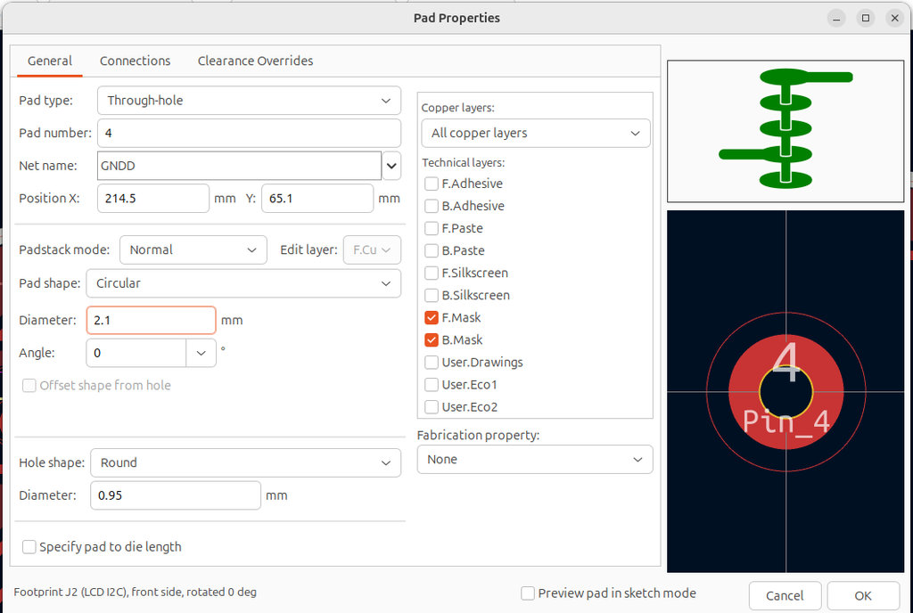 Once the design was complete, I moved on to setting the correct inner and outer diameters of the holes(2.1mm and 0.95mm), as well as adjusting other parameters. I set the clearance values to 0.4mm and the track width to 0.5 mm, connection width 0.5mm.