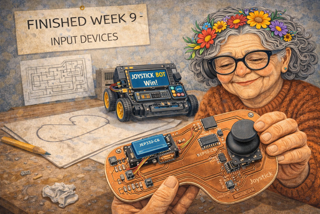 “Now need to generate an image when she started week 9 ''Input Devices''. This week she designed a new PCB like this image. This PCB is for her feature joystick PCB, and this PCB is programmed for Draw Car-Robot. This PCB has an LCD I2C, MCU ESP32C3, Battery, Switch-Button for Battery, and Joystick.”