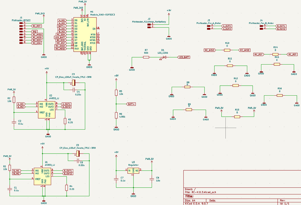 By studying the documentation(ESP32-C3 Documentation, A4953 Documentation, LM317 Documentation, RC522 Documentation), I understood how each component should be connected. I completed the schematic and then moved to the PCB design.