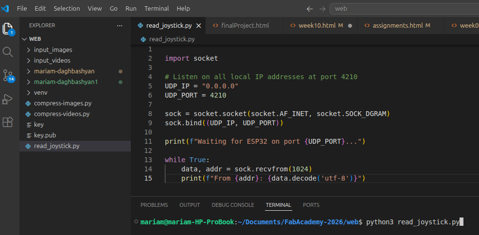 This week was kind of chaotic but also interesting. I tried to connect my RC car with the joystick using WiFi, step by step, first making the joystick send data and then trying to read it on my PC. That part actually worked and it was really satisfying to see the data coming live.