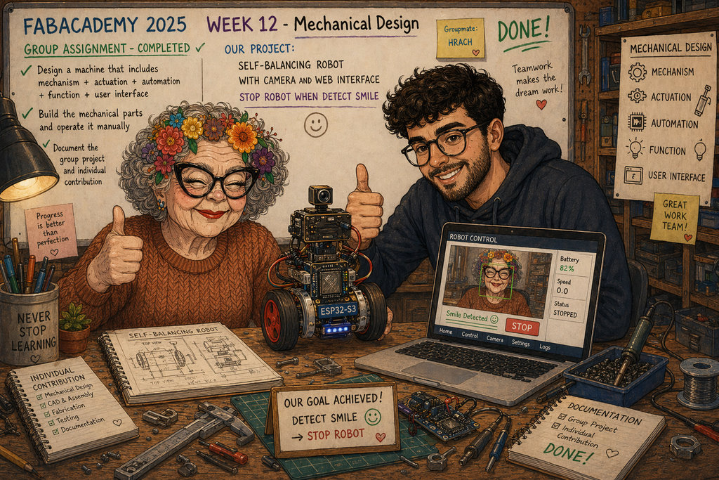 “Please generate an image when she started week 12 "Mechanical Design" this week have only a group assignment part, and she works with her groupmate Hrach. We decided to create a self-balancing robot withh a camera and a web interface and need to when detect smile nned to stop Robot. group assignment: • design a machine that includes mechanism+actuation+automation+function+user interface • build the mechanical parts and operate it manually • document the group project and your individual contribution”