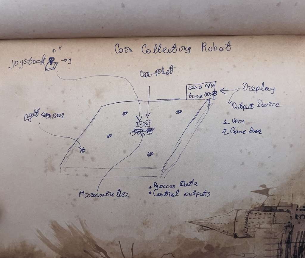 The game will be built on an MDF board, featuring a robot that will be controlled using a joystick. The goal is to collect a predefined number of coins within a limited time.
