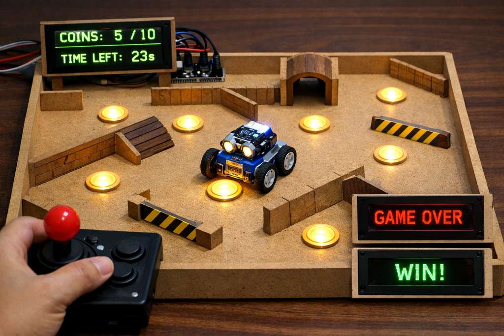 AI prompt: “Generate a photorealistic image of a tabletop maze game made from wood, featuring a small robotic car collecting glowing coins, obstacles, and walls. Include a digital display showing coins collected and time left, and a joystick controller held by a human hand.”