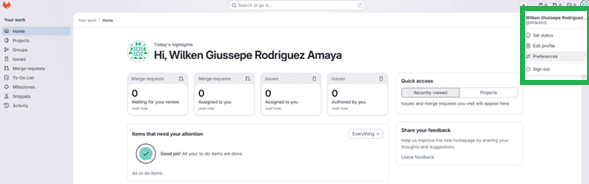From the GitLab dashboard, the user settings panel is accessed. This section centralizes account configuration, including security, access control, and authentication methods.