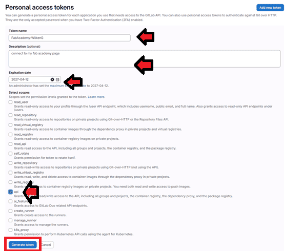 During token creation, parameters such as name, expiration date, and access scopes are defined. For this workflow, permissions like read_repository and write_repository were enabled to allow full interaction with the project.