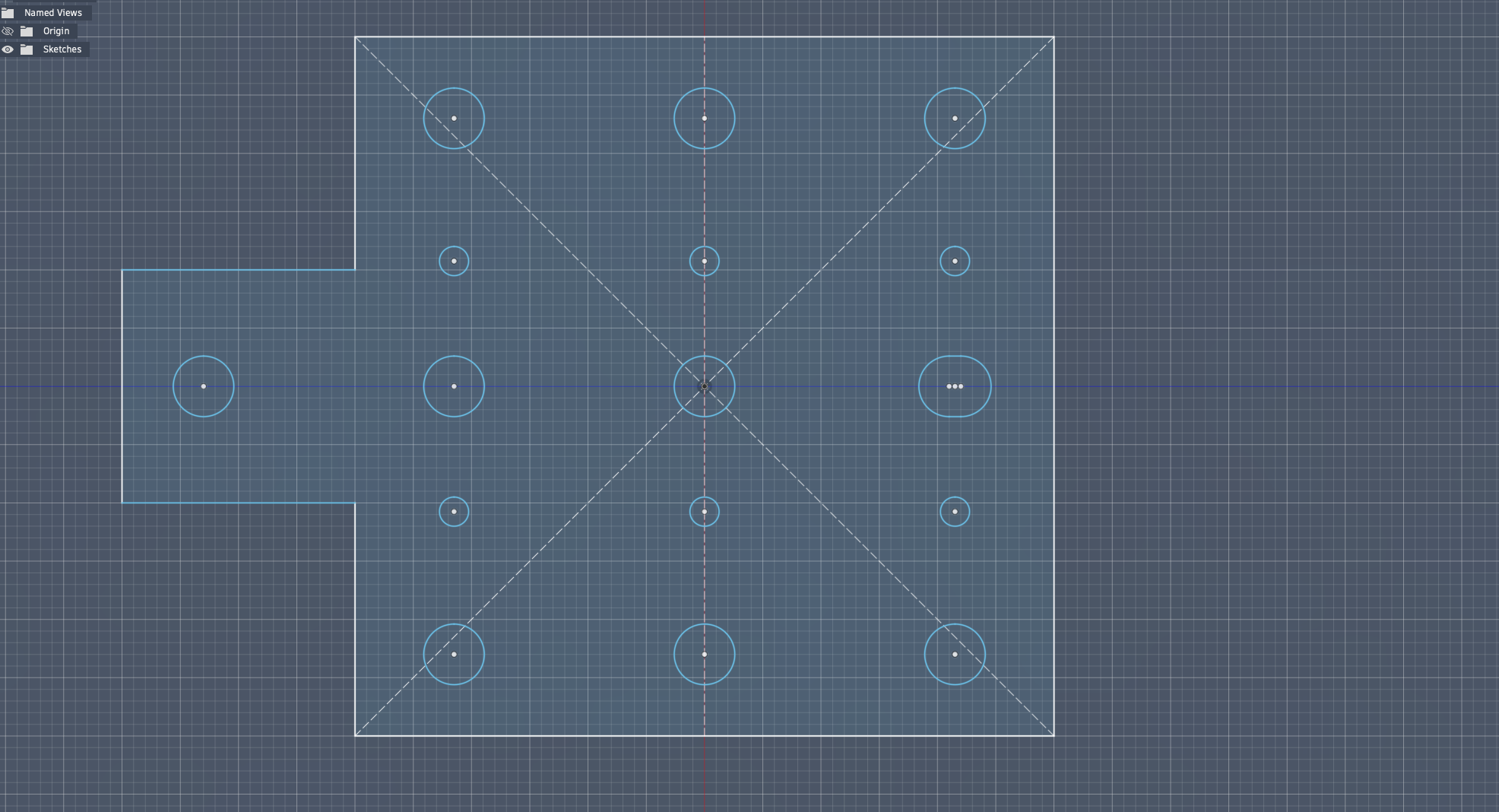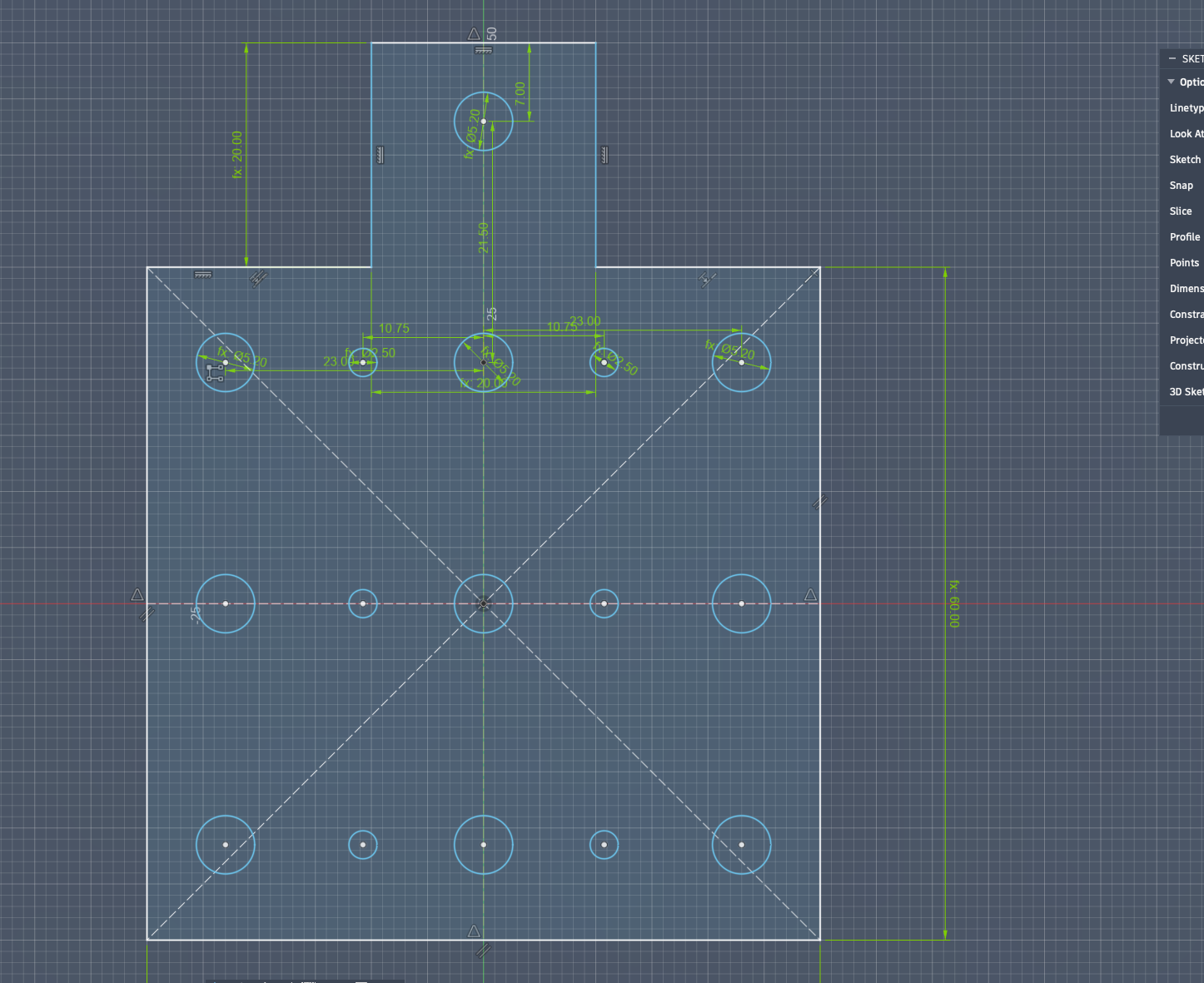 This is the initial sketch, which mostly makes up the base of the motor mount. The mount hole is fitted for a NEMA 17 motor. The slot holes are for M3 screws, while the two large holes are used to stabilize the holder on the profiles.