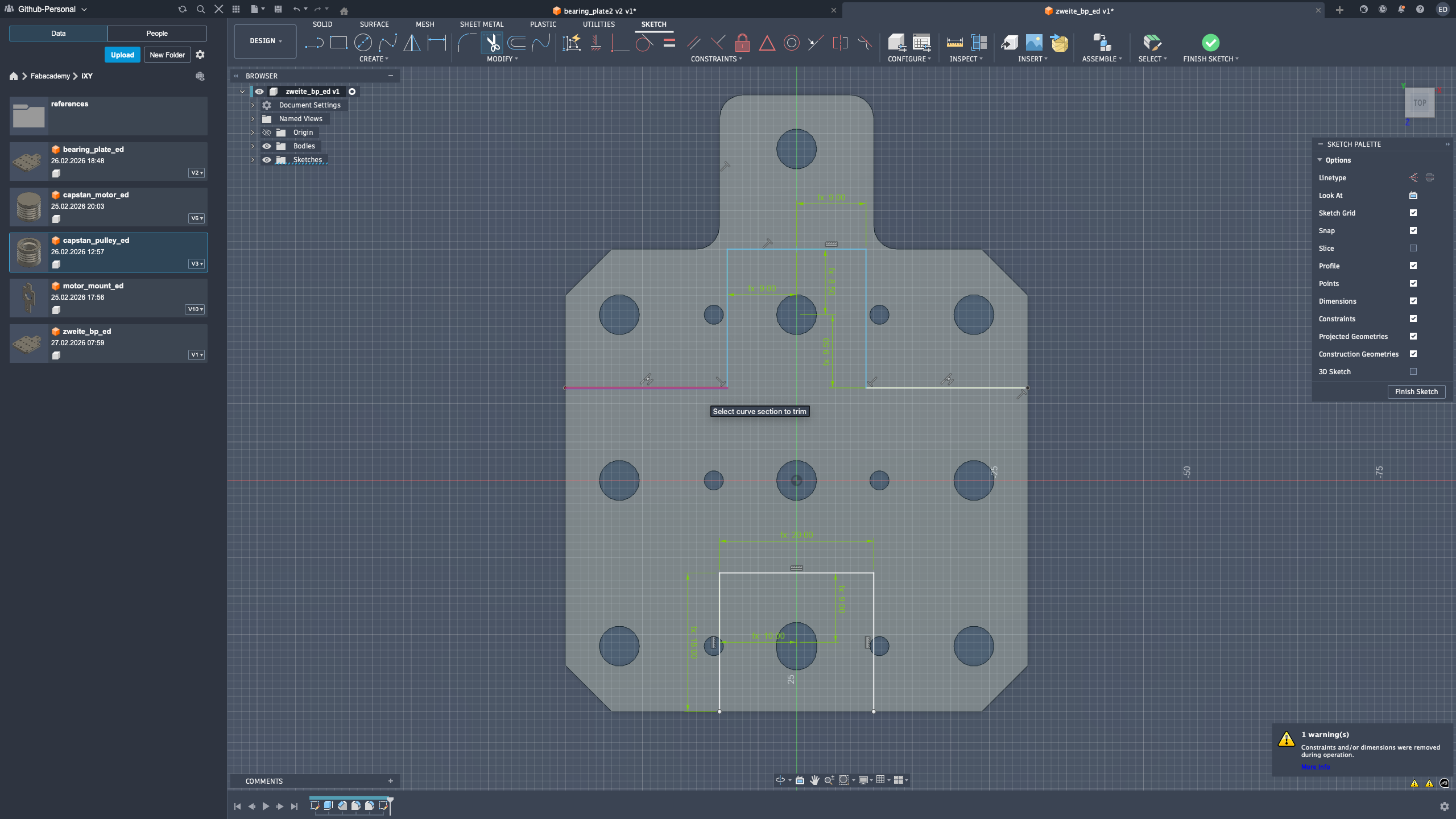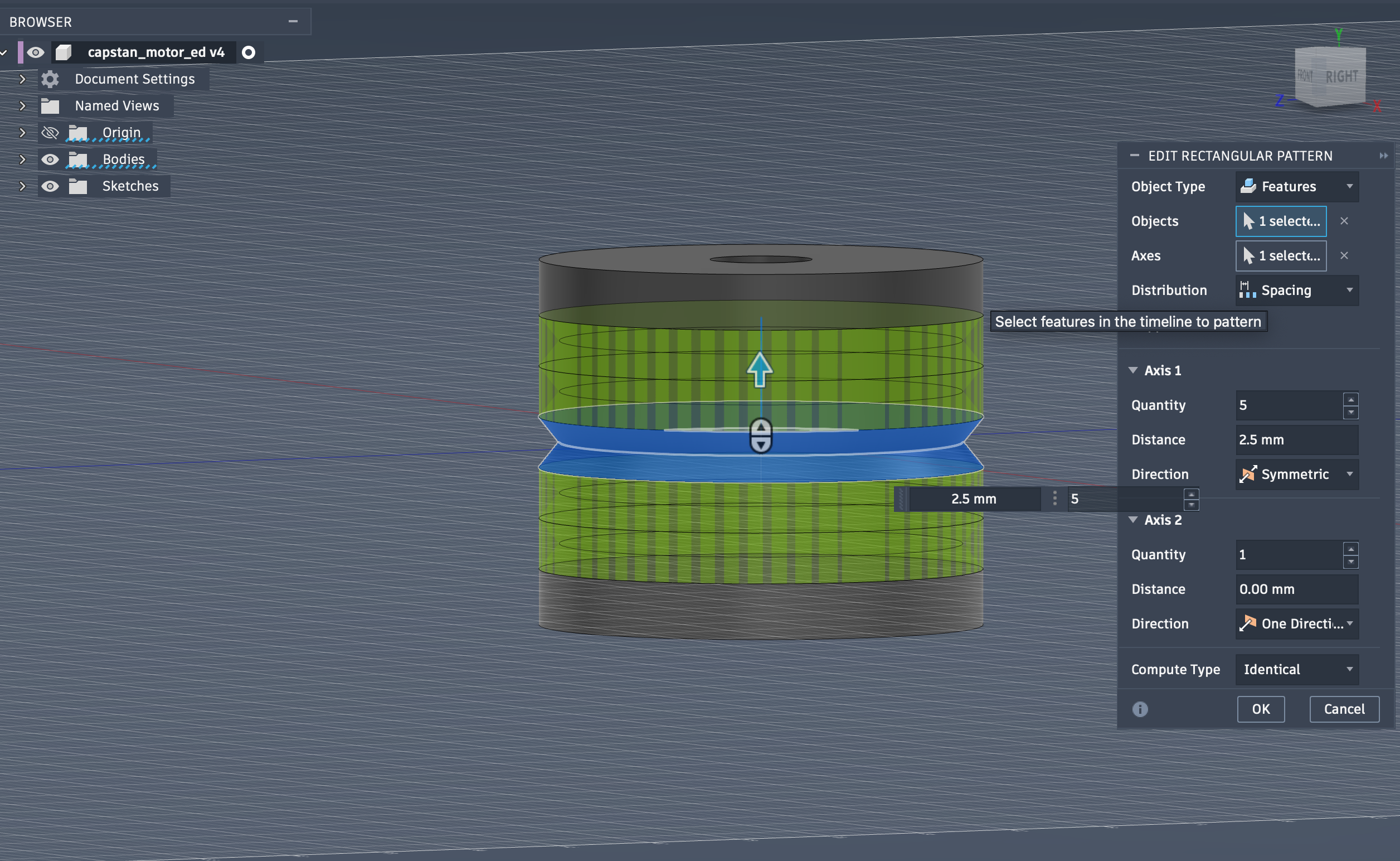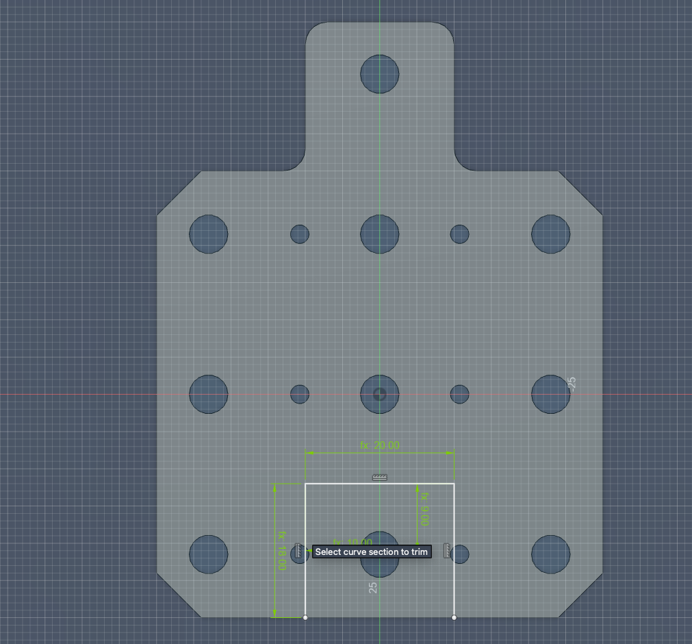 fail time.) I later realized that I didn’t need the smaller screw holes in the repeated formation that was given in the bp1 thus I went back in the sketch and got rid of them in the intial sketch and now will re-add them in appropriate locations that work for the piece