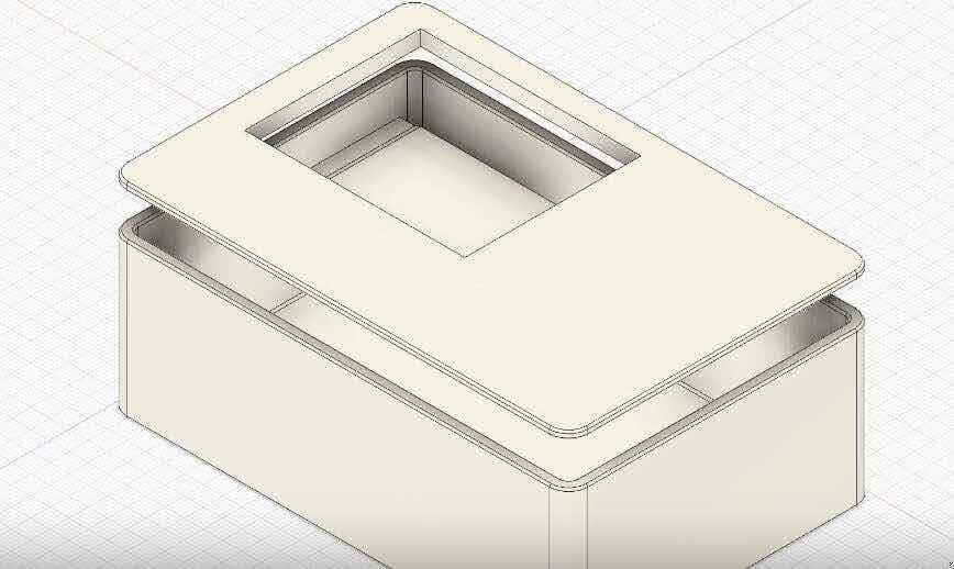 After creating the opening for the screen, I projected the cutout’s sketch onto the inner surface of the lid. Using this projection as a reference, I modeled a support platform inside the enclosure. This platform acts as a stable seat where the e-ink screen can rest securely, preventing it from shifting or falling deeper into the body. It also ensures the screen aligns perfectly with the front-facing window, keeping the display flush with the lid for a clean, professional appearance.