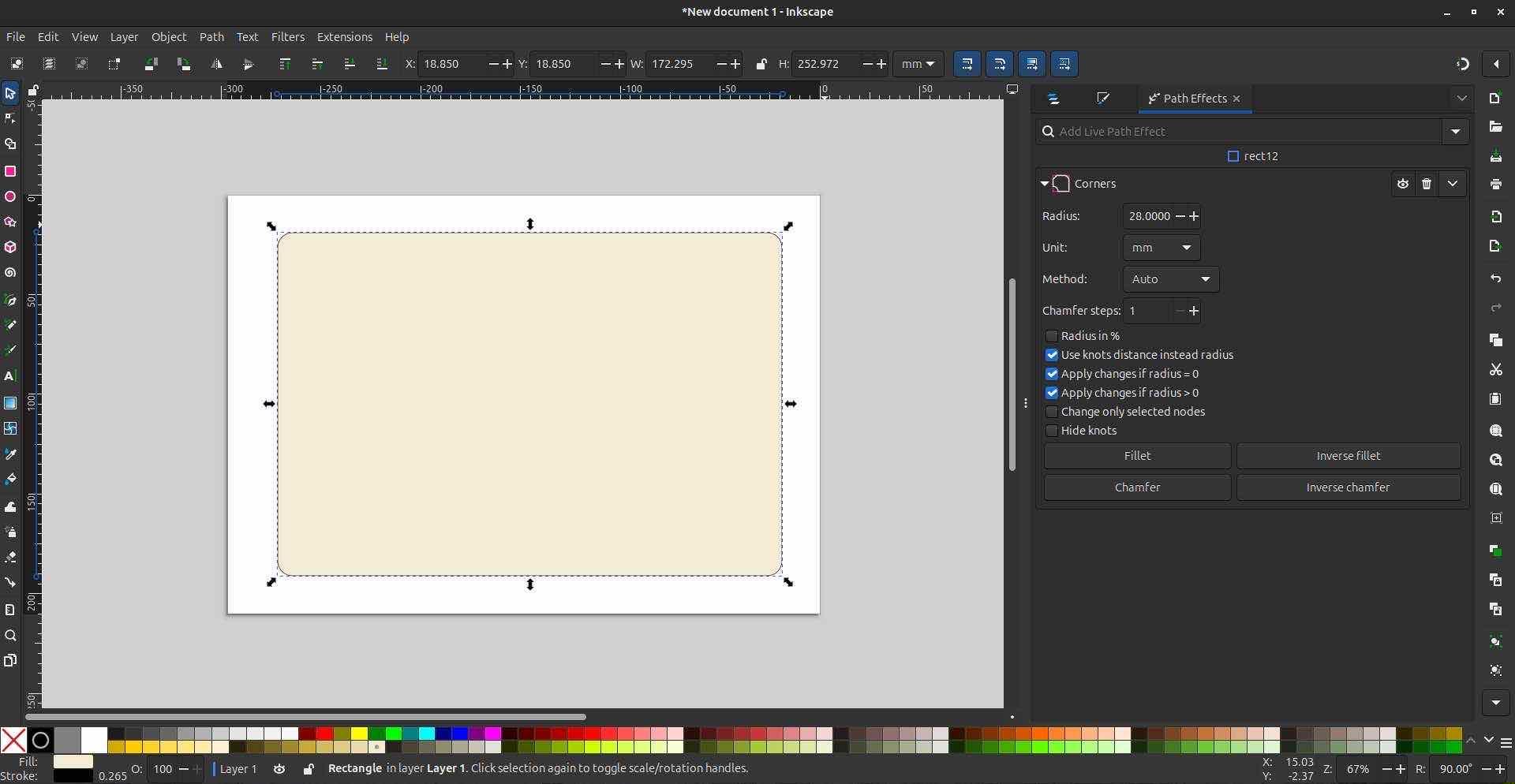 Vector means everything is defined by paths and math, so you can scale up or down without losing sharpness—the same shape, just recalculated. Inkscape has a proper fillet tool, so rounding corners is a couple of clicks instead of the delete-and-fill dance I did in GIMP. Drop shadow and page rotation are right there in the menus, which made the front panel feel more finished without fighting the software. I’d used Inkscape before mainly for “resize page to selection” when prepping PCBs; using it as a real design tool showed how well it fits precise 2D layout—dimensions, alignment, export to SVG or DXF for laser or milling. For anything that needs to stay sharp at any size or feed into a fabrication workflow, this is the 2D workflow that holds up.