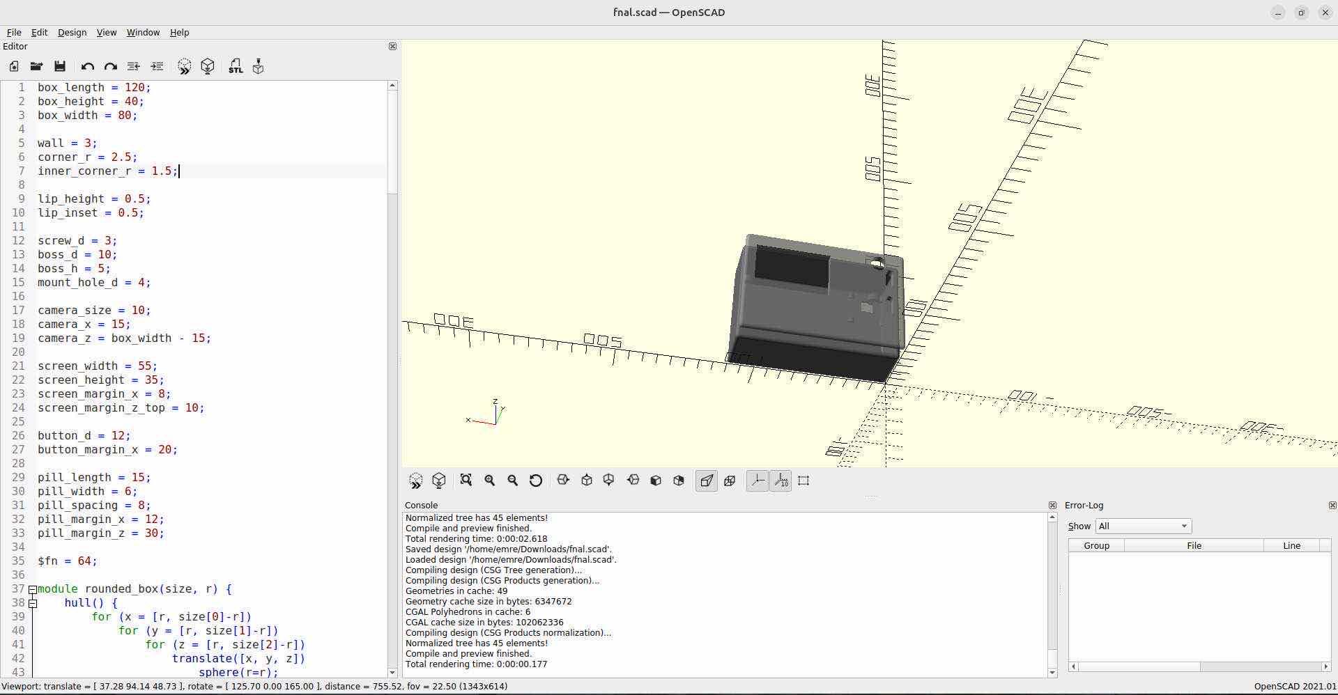 In OpenSCAD the code is the single source of truth—variables at the top (box_length, wall, corner_r, etc.) and modules for repeated bits (rounded_box, lid, pcb_standoffs) keep everything consistent and easy to change. hull() around spheres gives you rounded boxes without a fillet tool; difference() is your boolean cut. You build the shape from primitives and operations, which fits how you think about “hollow box with holes and a lip.” It’s strong when you want algorithmic or batch variants (e.g. “every size from 80 to 120 mm” or “generate a grid of standoffs”) or when you’re comfortable thinking in code and want version control and reuse. For one-off organic or sculpted forms it’s slower than a direct modeler—no pushing vertices, no sculpt brush. For enclosures and mechanical parts with clear dimensions and relationships, the tradeoff is clear: code gives you repeatability and clarity, and the output (STL) is just as usable as Fusion or anything else for printing or CAM.