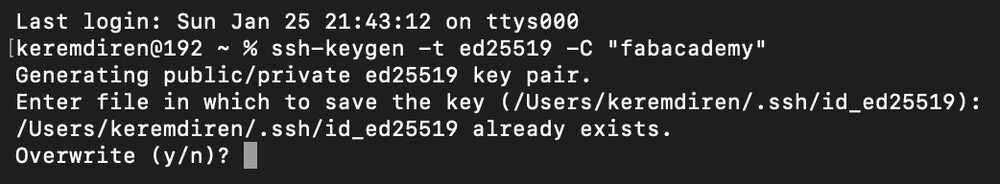 I wrote ssh-keygen -t ed25519 -C "fabacademy" into terminal. Because I already had an SSH key, the terminal asked me this: