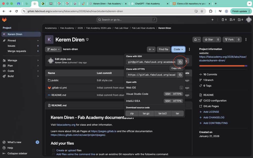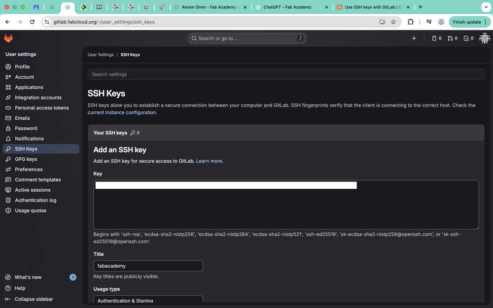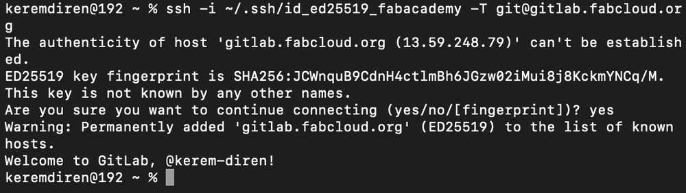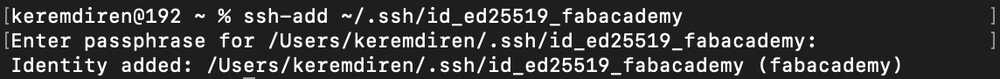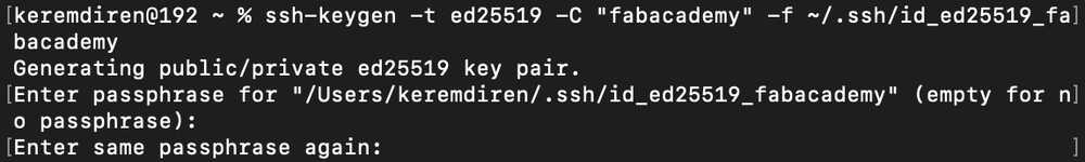 I wrote ssh-keygen -t ed25519 -C "fabacademy" -f ~/.ssh/id_ed25519_fabacademy into the terminal and kept following the tutorial.