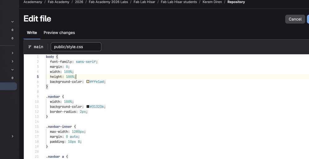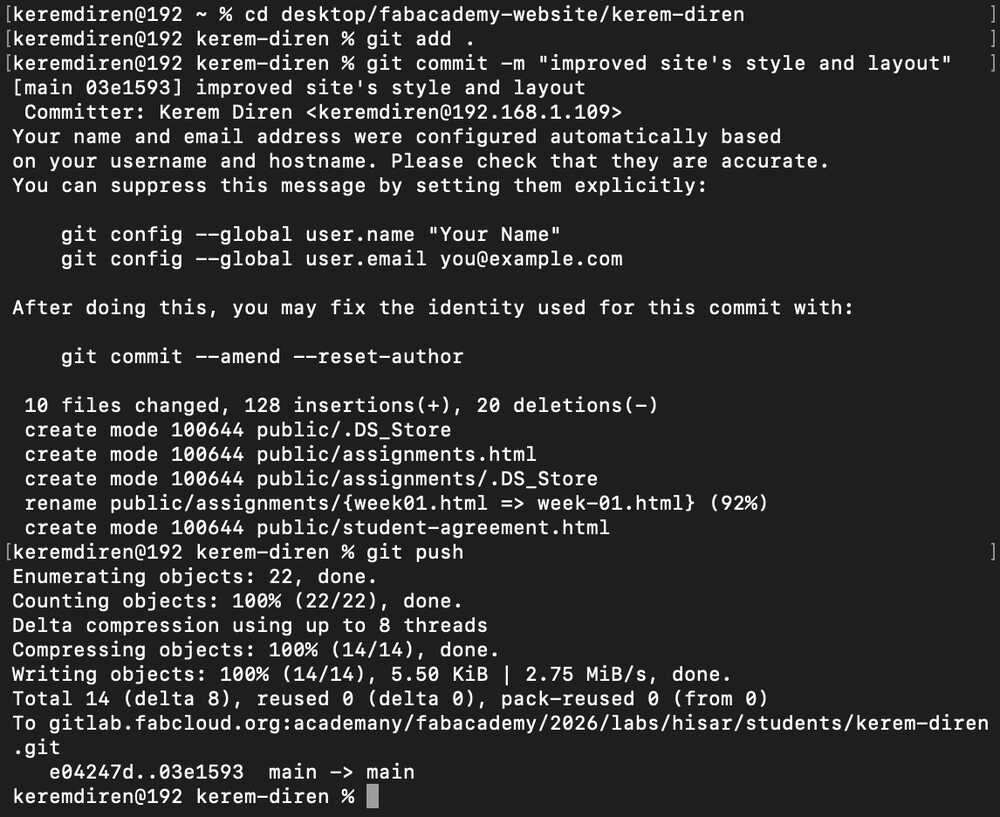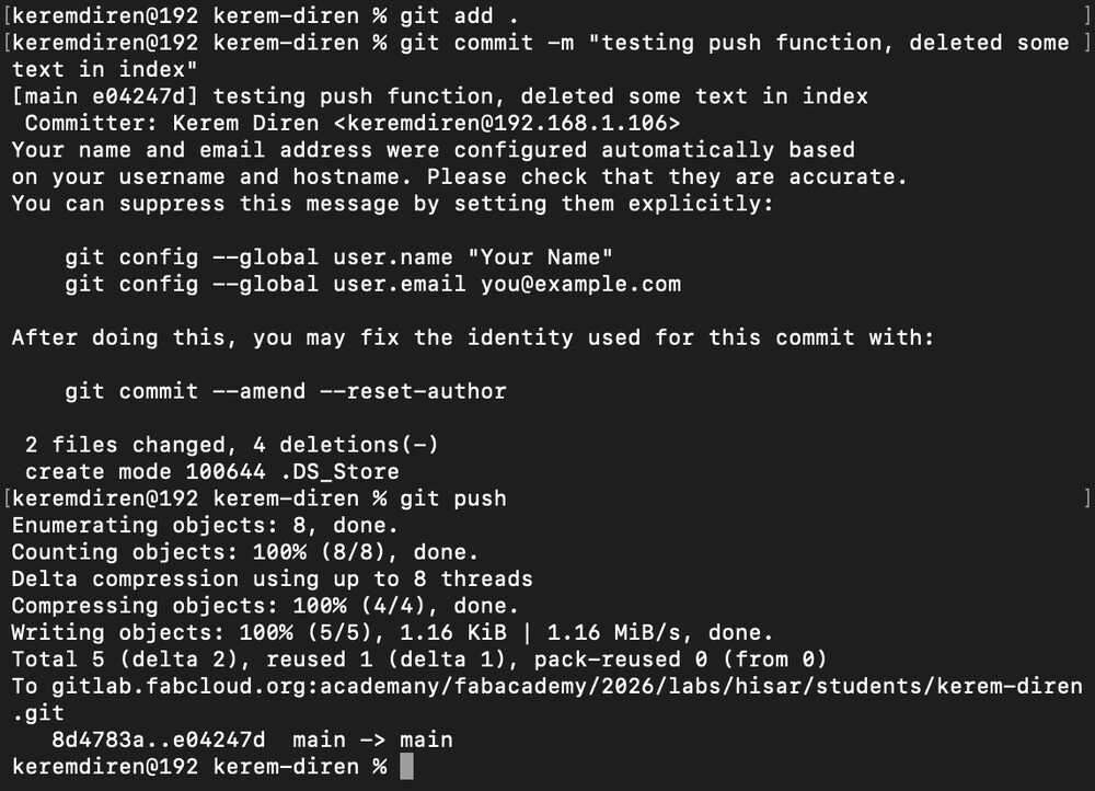 Then, I opened my terminal again and navigated to my project file "kerem-diren". Then, I wrote git add . into the terminal to basically select all changes I did in my project files. Then, I wrote git commit -m "some message" to commit the changes I just did. Finally, I wrote git push to push every change I committed previously. This basically updated my GitLab project files with the changes I just did to the project files in my desktop.