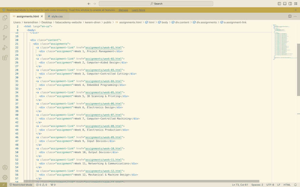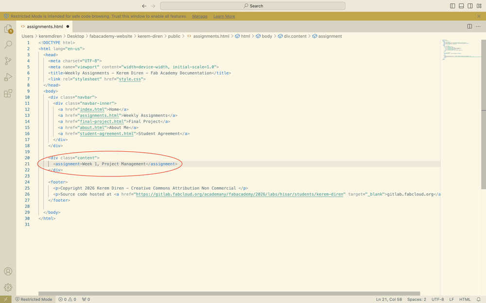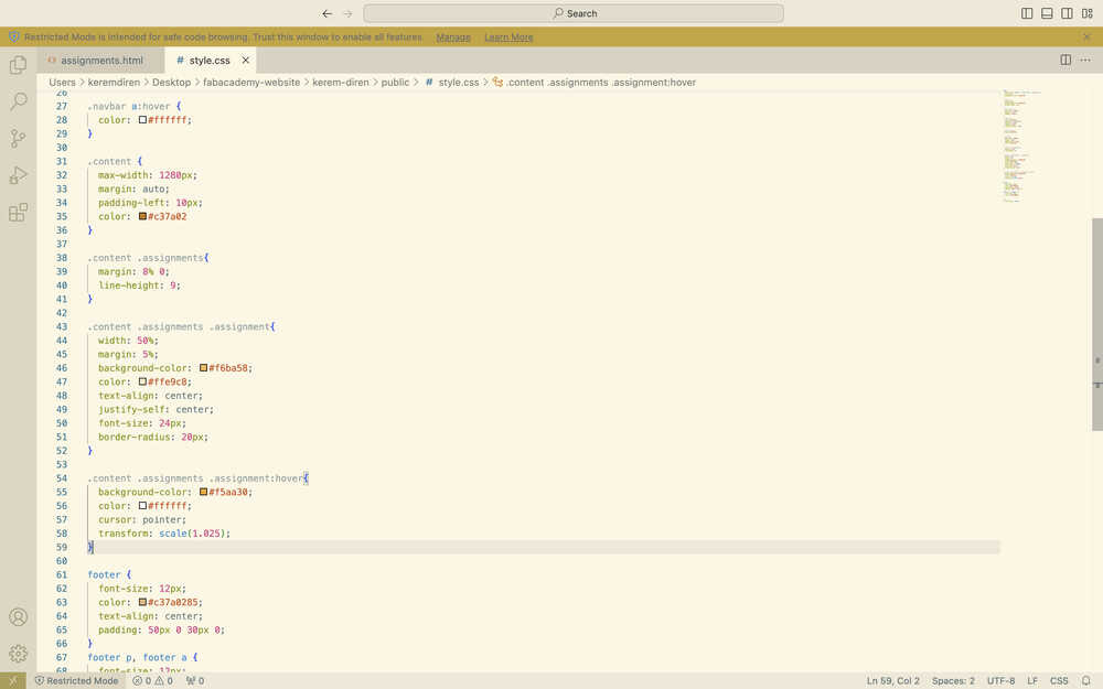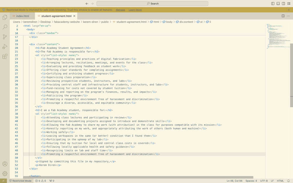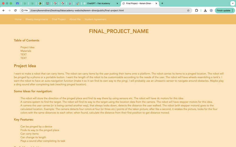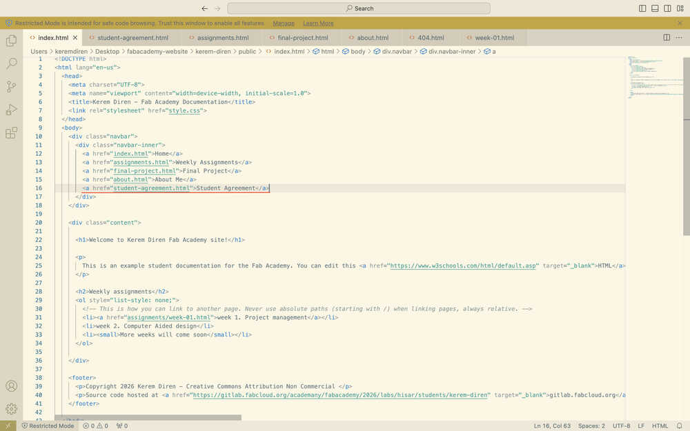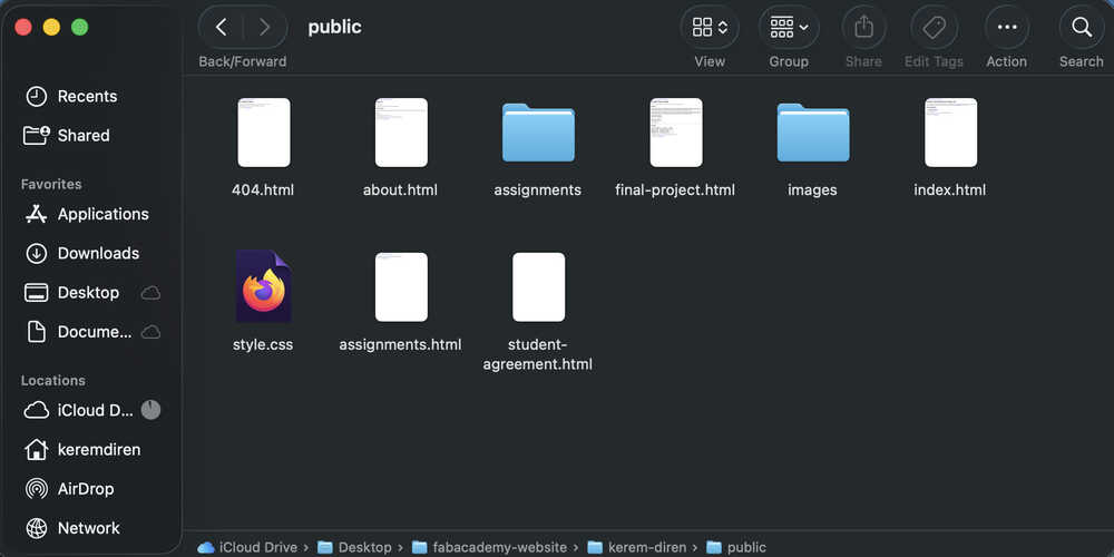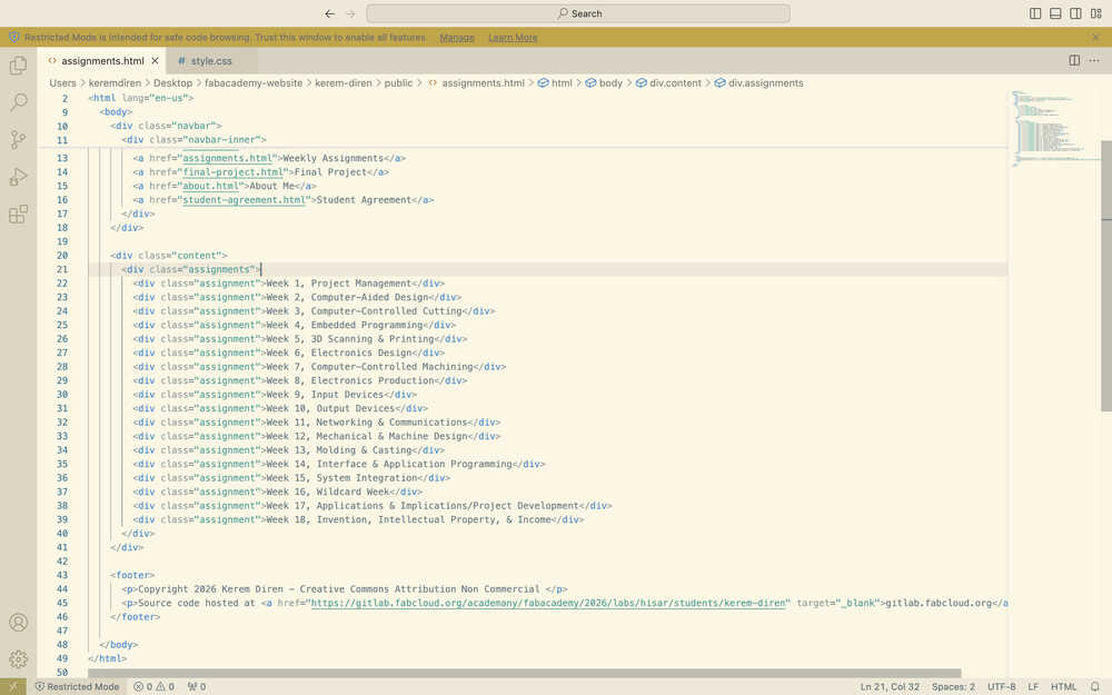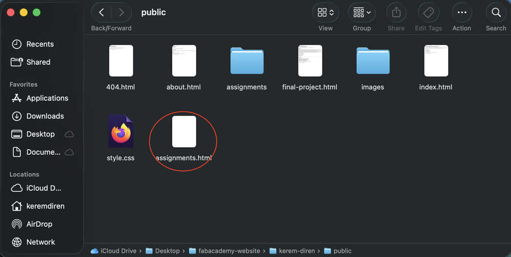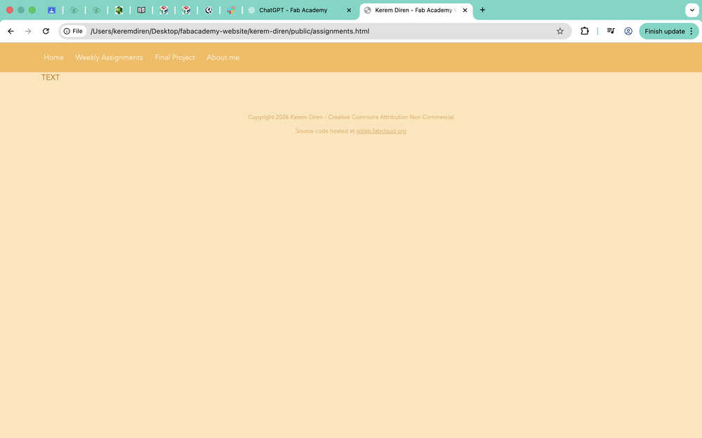 While doing this, I also changed the navigation bar of my other pages to match the ones in home and the assignments page. I also changed some file names and replaced the instances of "your name" in some of my files with "Kerem Diren".